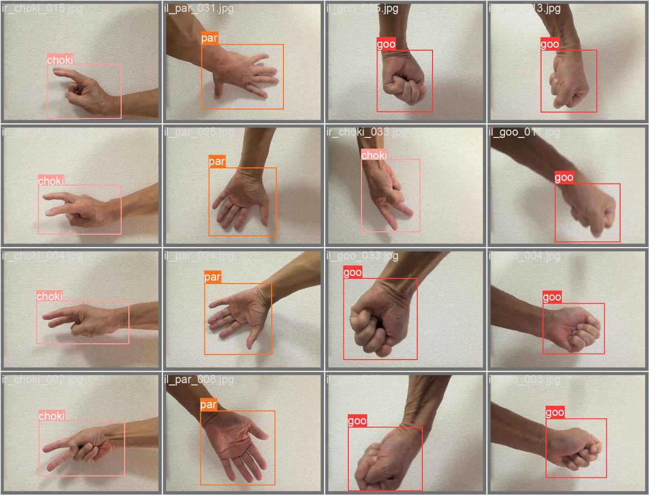 (py_learn) python train.py --epochs 100 --data data/janken4_dataset/janken4_dataset.yaml --weights yolov5s.pt --name janken4_yolov5s・GPU を使用しない場合は以下のコマンドを実行する