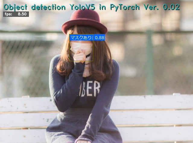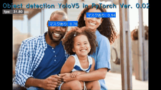 (py_learn) python detect2_yolov5.py -m ./runs/train/mask_yolov5s/weights/best.pt -i ../../Images/mask-test.jpg -l mask_names_jp Object detection YoloV5 in PyTorch Ver. 0.02: Starting application... OpenCV virsion : 4.9.0 - Image File : ../../Images/mask-test.jpg - YOLO v5 : ultralytics/yolov5 - Pretrained : ./runs/train/mask_yolov5s/weights/best.pt - Label file : mask_names_jp - Program Title: y - Speed flag : y - Processed out: non - Use device : cuda:0 Using cache found in C:\Users\izuts/.cache\torch\hub\ultralytics_yolov5_master YOLOv5 2024-4-9 Python-3.11.8 torch-2.2.1+cu121 CUDA:0 (NVIDIA GeForce RTX 4070 Ti, 12282MiB) Fusing layers... Model summary: 157 layers, 7020913 parameters, 0 gradients, 15.8 GFLOPs Adding AutoShape... FPS average: 9.00 Finished.