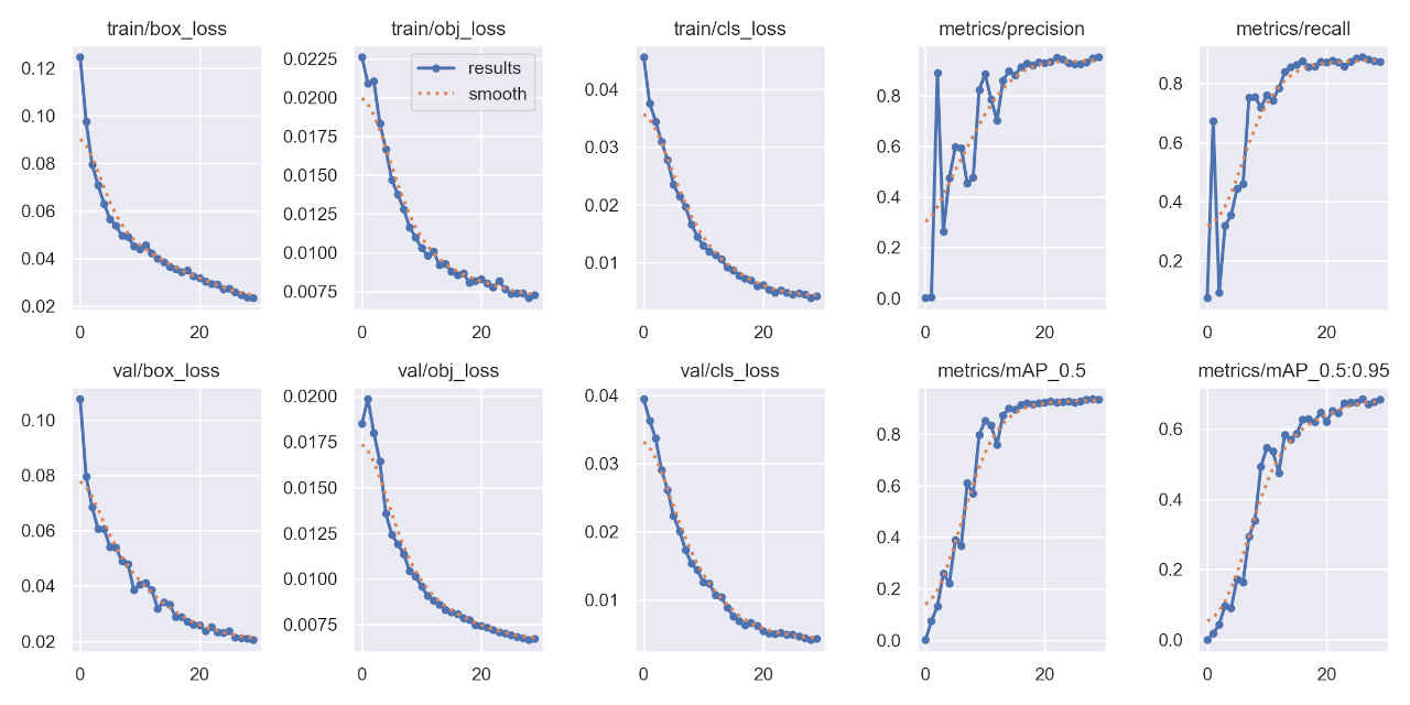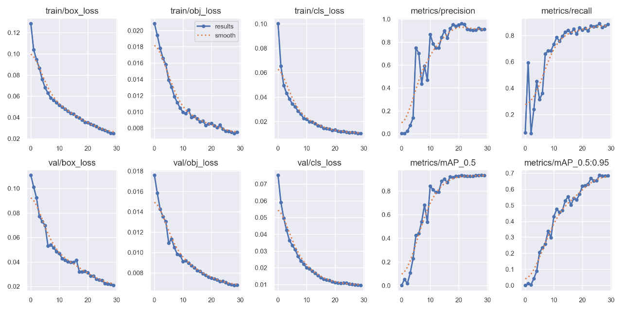 (py_learn) python train.py --data data/ts_dataset/ts.yaml --weights yolov5s.pt --img 640 --epochs 30 --name ts_yolov5s_ep30 train: weights=yolov5s.pt, cfg=, data=data/ts_dataset/ts.yaml, hyp=data\hyps\hyp.scratch-low.yaml, epochs=30, batch_size=16, imgsz=640, rect=False, resume=False, nosave=False, noval=False, noautoanchor=False, noplots=False, evolve=None, evolve_population=data\hyps, resume_evolve=None, bucket=, cache=None, image_weights=False, device=, multi_scale=False, single_cls=False, optimizer=SGD, sync_bn=False, workers=8, project=runs\train, name=ts_yolov5s_ep30, exist_ok=False, quad=False, cos_lr=False, label_smoothing=0.0, patience=100, freeze=[0], save_period=-1, seed=0, local_rank=-1, entity=None, upload_dataset=False, bbox_interval=-1, artifact_alias=latest, ndjson_console=False, ndjson_file=False remote: Enumerating objects: 24, done. remote: Counting objects: 100% (24/24), done. remote: Compressing objects: 100% (24/24), done. remote: Total 24 (delta 13), reused 1 (delta 0), pack-reused 0 Unpacking objects: 100% (24/24), 9.93 KiB | 462.00 KiB/s, done. From https://github.com/ultralytics/yolov5 d07d0cf6..cf8b67b7 master -> origin/master github: YOLOv5 is out of date by 9 commits. Use 'git pull' or 'git clone https://github.com/ultralytics/yolov5' to update. YOLOv5 v7.0-294-gdb125a20 Python-3.11.8 torch-2.2.1+cu121 CUDA:0 (NVIDIA GeForce RTX 4070 Ti, 12282MiB) hyperparameters: lr0=0.01, lrf=0.01, momentum=0.937, weight_decay=0.0005, warmup_epochs=3.0, warmup_momentum=0.8, warmup_bias_lr=0.1, box=0.05, cls=0.5, cls_pw=1.0, obj=1.0, obj_pw=1.0, iou_t=0.2, anchor_t=4.0, fl_gamma=0.0, hsv_h=0.015, hsv_s=0.7, hsv_v=0.4, degrees=0.0, translate=0.1, scale=0.5, shear=0.0, perspective=0.0, flipud=0.0, fliplr=0.5, mosaic=1.0, mixup=0.0, copy_paste=0.0 Comet: run 'pip install comet_ml' to automatically track and visualize YOLOv5 runs in Comet TensorBoard: Start with 'tensorboard --logdir runs\train', view at http://localhost:6006/ Overriding model.yaml nc=80 with nc=84 from n params module arguments 0 -1 1 3520 models.common.Conv [3, 32, 6, 2, 2] 1 -1 1 18560 models.common.Conv [32, 64, 3, 2] 2 -1 1 18816 models.common.C3 [64, 64, 1] 3 -1 1 73984 models.common.Conv [64, 128, 3, 2] : Starting training for 30 epochs... Epoch GPU_mem box_loss obj_loss cls_loss Instances Size 0/29 3.42G 0.1287 0.02085 0.1002 46 640: 100%|██████████| 37/37 [00:04<00:00, 8. Class Images Instances P R mAP50 mAP50-95: 100%|██████████| 5/5 [00:00<0 all 150 230 0.00304 0.0611 0.00226 0.000532 : Epoch GPU_mem box_loss obj_loss cls_loss Instances Size 29/29 3.65G 0.02481 0.007517 0.01037 49 640: 100%|██████████| 37/37 [00:03<00:00, 11. Class Images Instances P R mAP50 mAP50-95: 100%|██████████| 5/5 [00:00<0 all 150 230 0.912 0.884 0.933 0.684 30 epochs completed in 0.036 hours. Optimizer stripped from runs\train\ts_yolov5s_ep30\weights\last.pt, 14.8MB Optimizer stripped from runs\train\ts_yolov5s_ep30\weights\best.pt, 14.8MB Validating runs\train\ts_yolov5s_ep30\weights\best.pt... Fusing layers... Model summary: 157 layers, 7236673 parameters, 0 gradients, 16.5 GFLOPs Class Images Instances P R mAP50 mAP50-95: 100%|██████████| 5/5 [00:01<0 all 150 230 0.905 0.89 0.932 0.689 prohibitory 150 108 0.954 0.953 0.98 0.763 danger 150 38 0.934 0.921 0.959 0.684 mandatory 150 35 0.876 0.81 0.9 0.687 other 150 49 0.854 0.878 0.89 0.621 Results saved to runs\train\ts_yolov5s_ep30