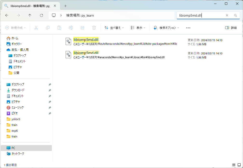 "C:\Users\<USER>\anaconda3\envs\py_learn\Lib\site-packages\torch\lib\libiomp5md.dll" "C:\Users\<USER>\anaconda3\envs\py_learn\Library\bin\libiomp5md.dll"2. 2つ目の「libiomp5md.dll」を「temp/」(どこでもよい)へ移動