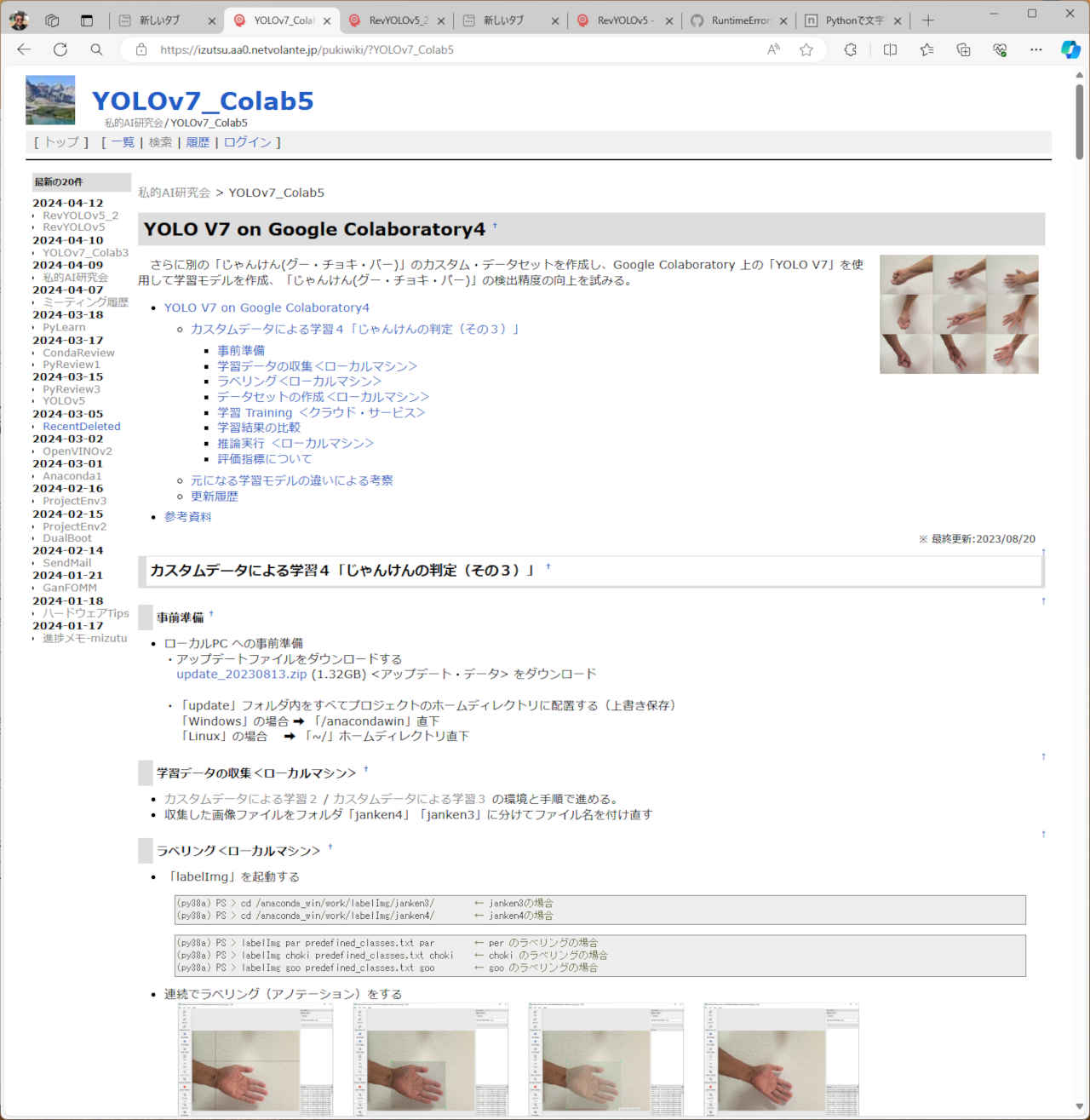 update ├─workspace_py37 │ └─mylib └─workspace_pylearn └─yolov5 ├─data │ ├─images │ ├─janken4_dataset ※1 学習用データセット │ ├─mask_dataset ※1 │ ├─ts0_dataset ※1 │ └─ts_dataset ※1 └─runs └─train ├─janken4_yolov5s ※2 学習結果 ├─mask_yolov5s ※2 ├─ts0_yolov5s_ep30 ※2 └─ts_yolov5s_ep30 ※2※1 以下のプロジェクトの『前準備』を行った結果のデータセット