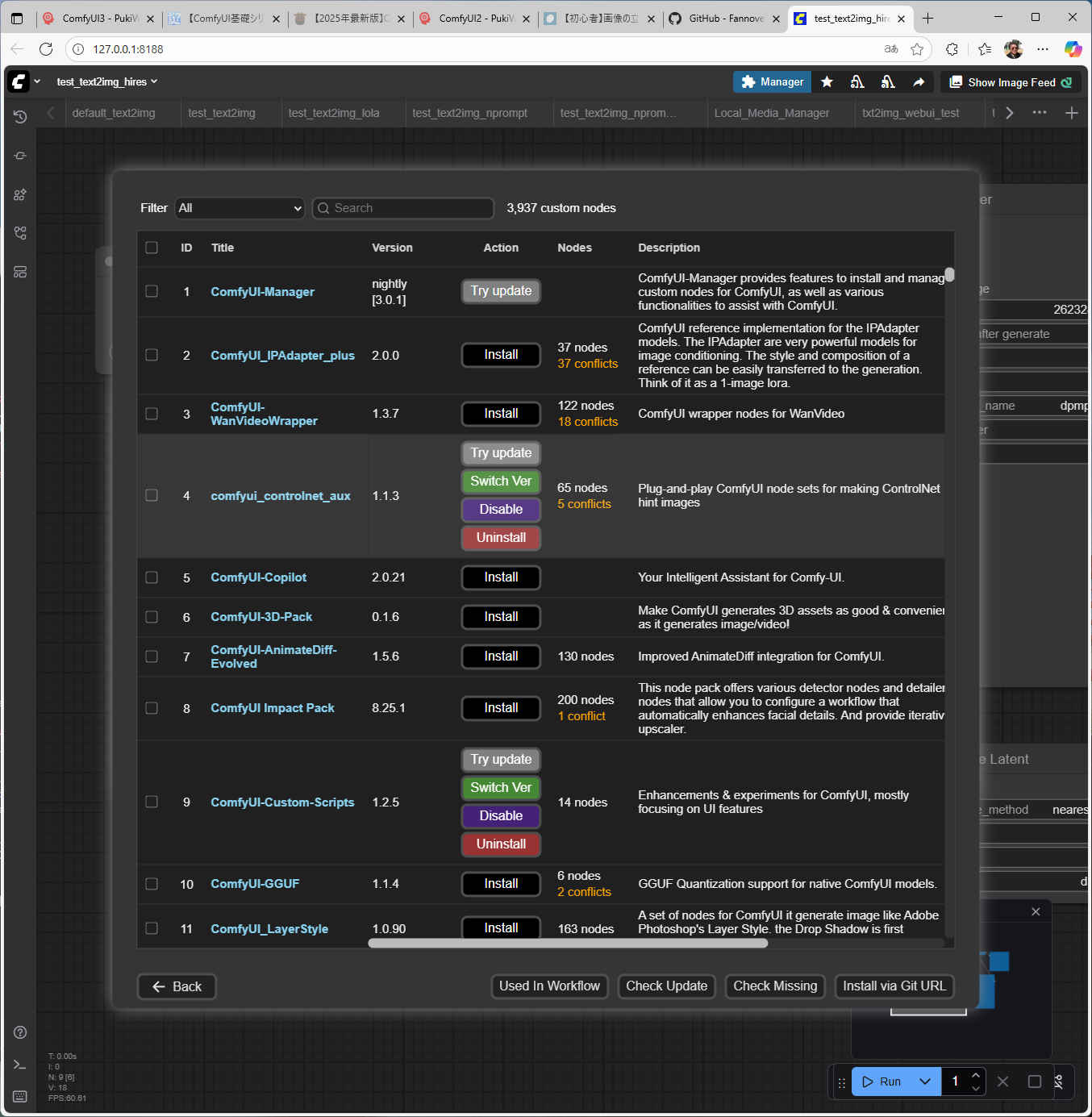 カスタムノードは「ComfyUI Manager」を使って下記の手順でインストールできる