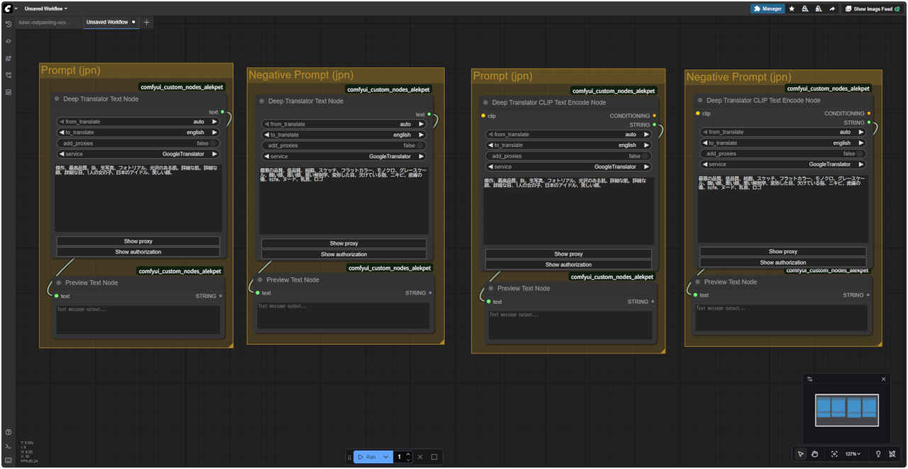 ⑤「Deep Transrator Text Node」「Preview Text Node」ノードで日本語訳を見ることができる