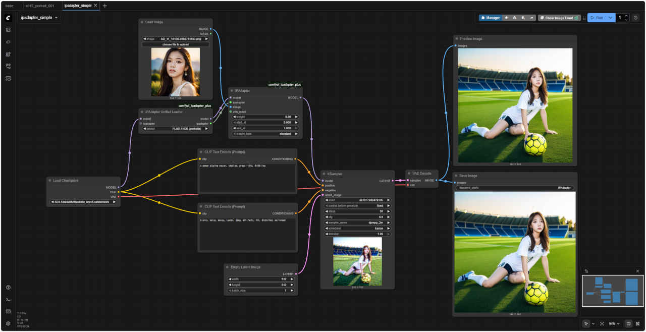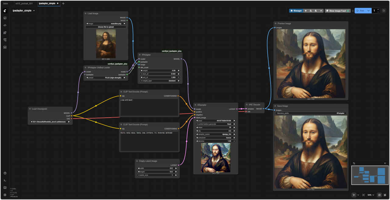 ① ノード添付の サンプル基本ワークフロー「custom_nodes/comfyui_ipadapter_plus/examples/ipadapter_simple.json」を読み出す