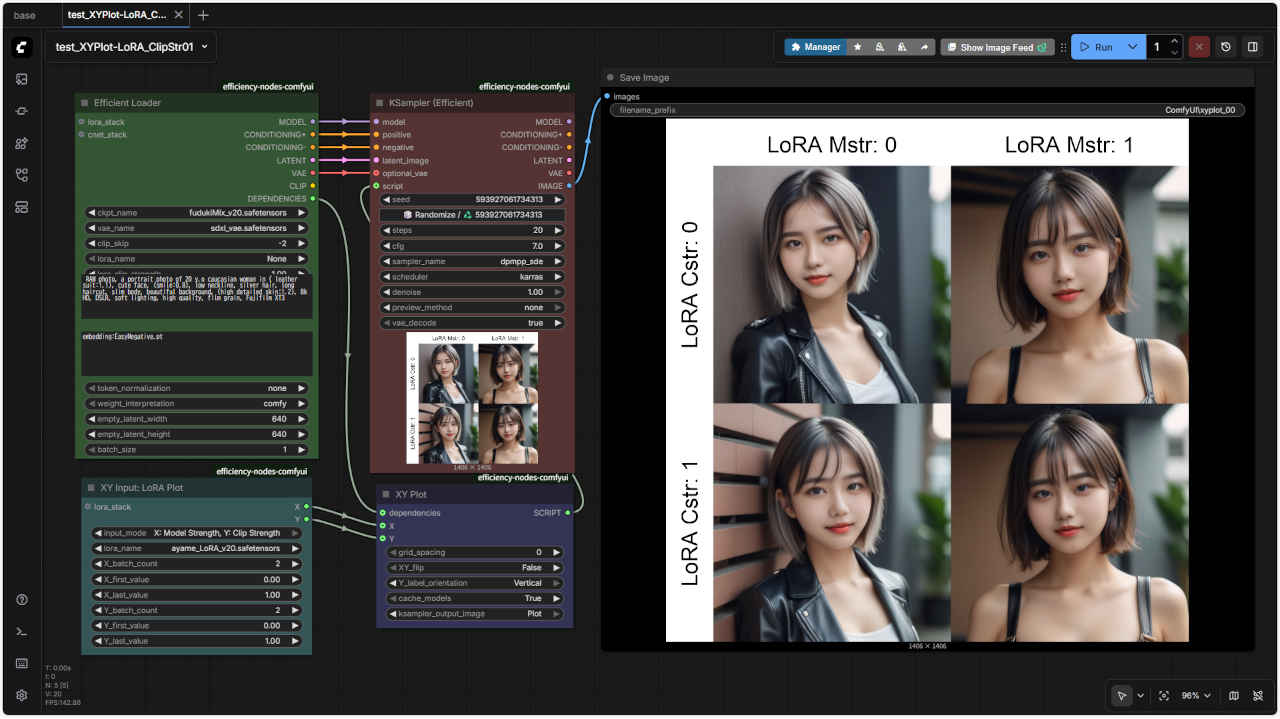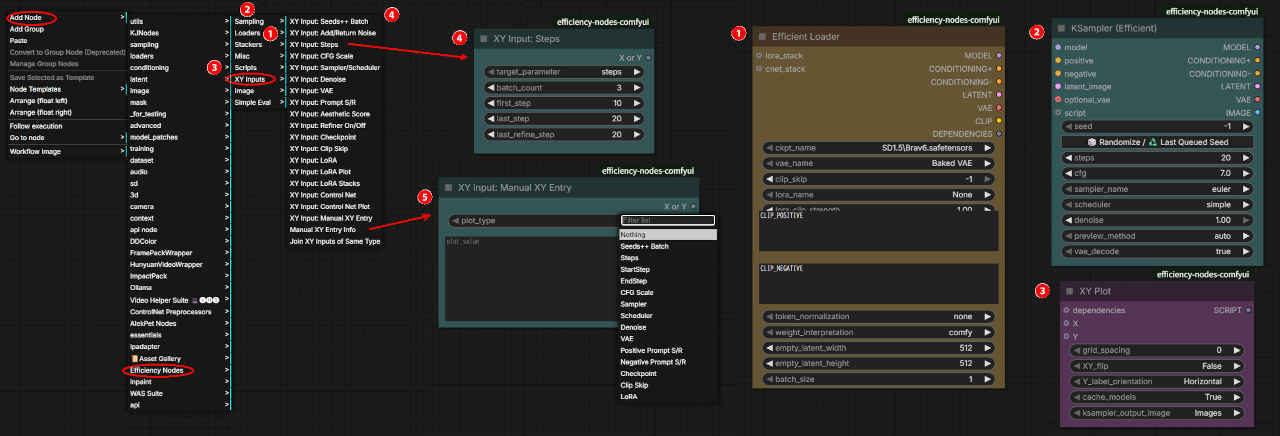 「Efficiency Nodes」カスタムノードを使用して、手動で何度も生成し直す手間を省き、最適な画像パラメータを効率的に探すのに使われる