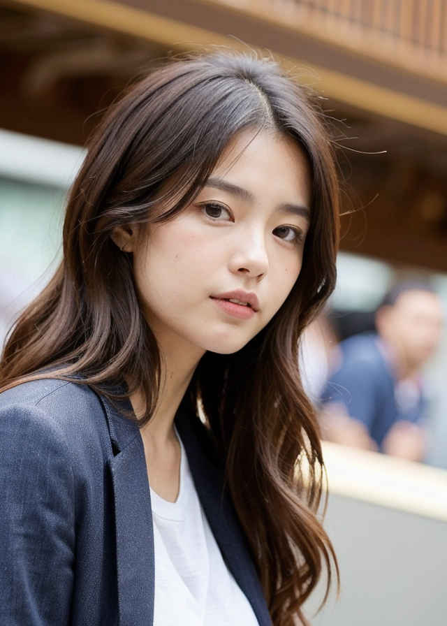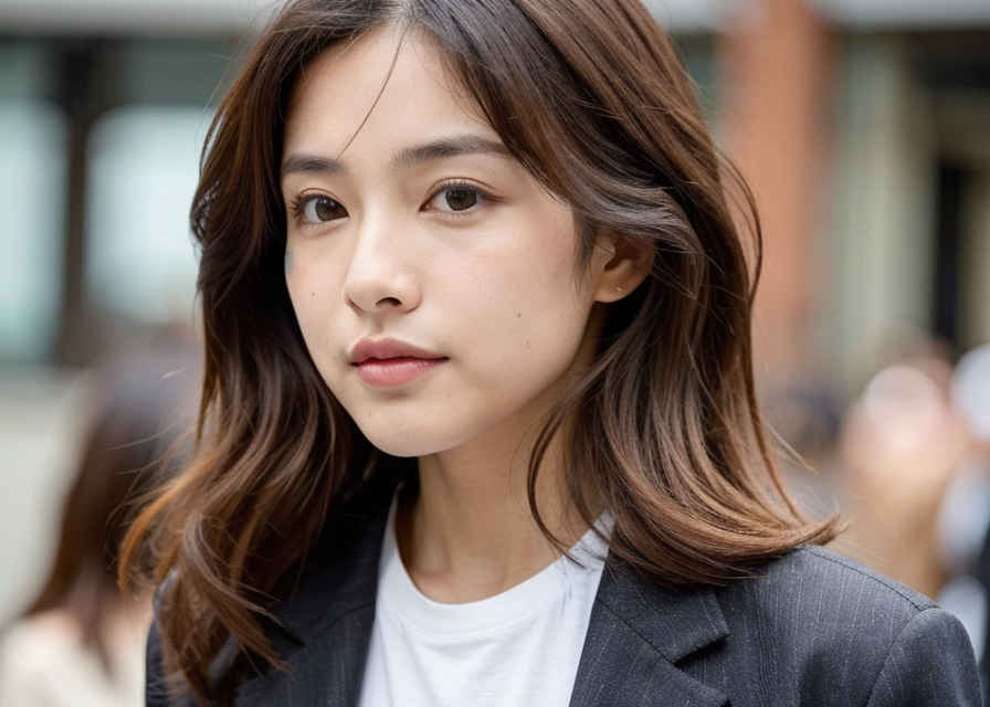(close up of face shot, best angle photo of standing japanese girl, bokeh, cinematic, aesthetic), long wavy hair in a chestnut brown hue, deep set black eyes, and a warm skin tone. She is dressed in a casual yet chic blazer, graphic tee, and jeans. |
