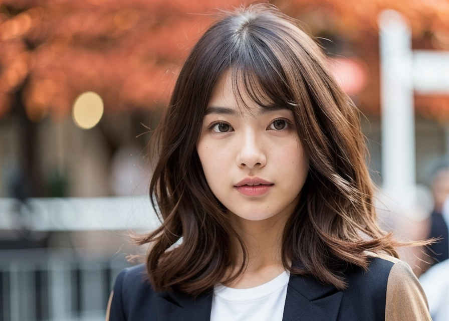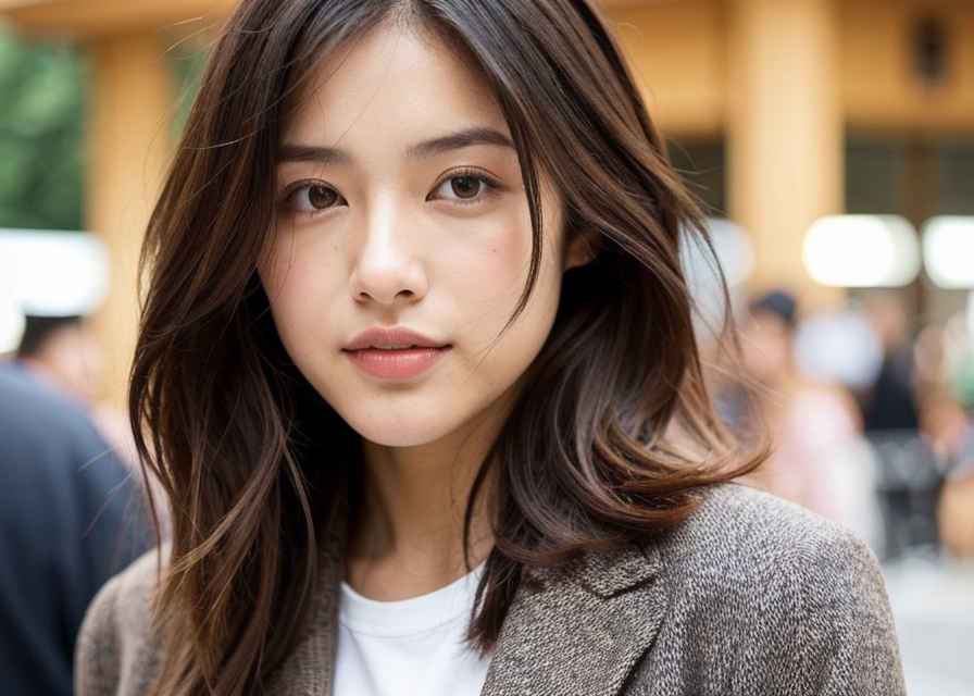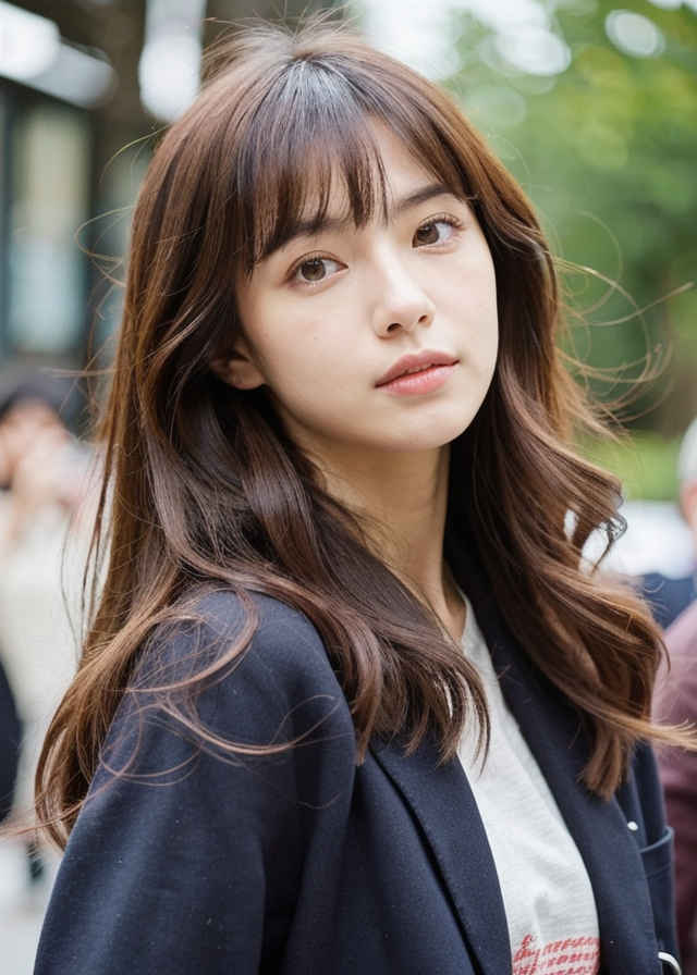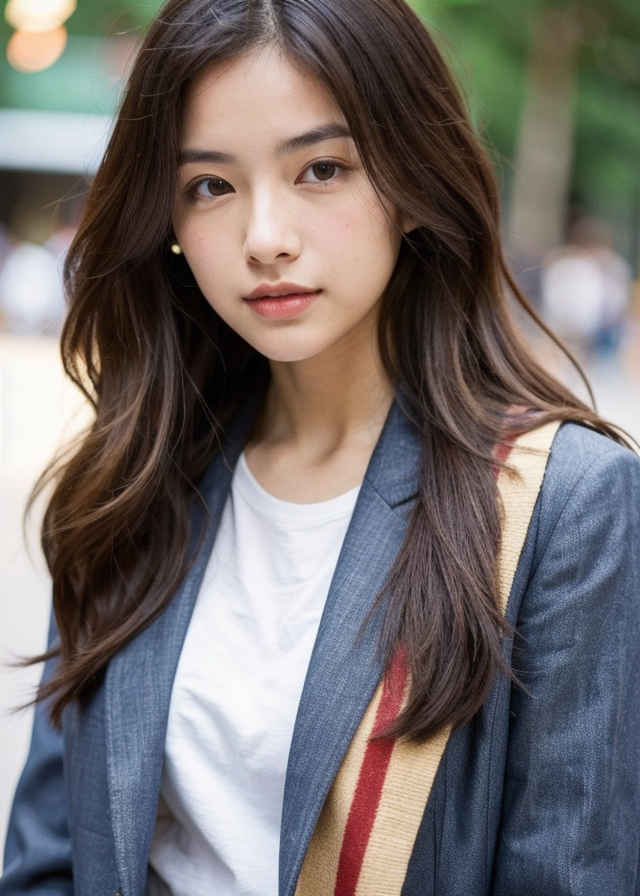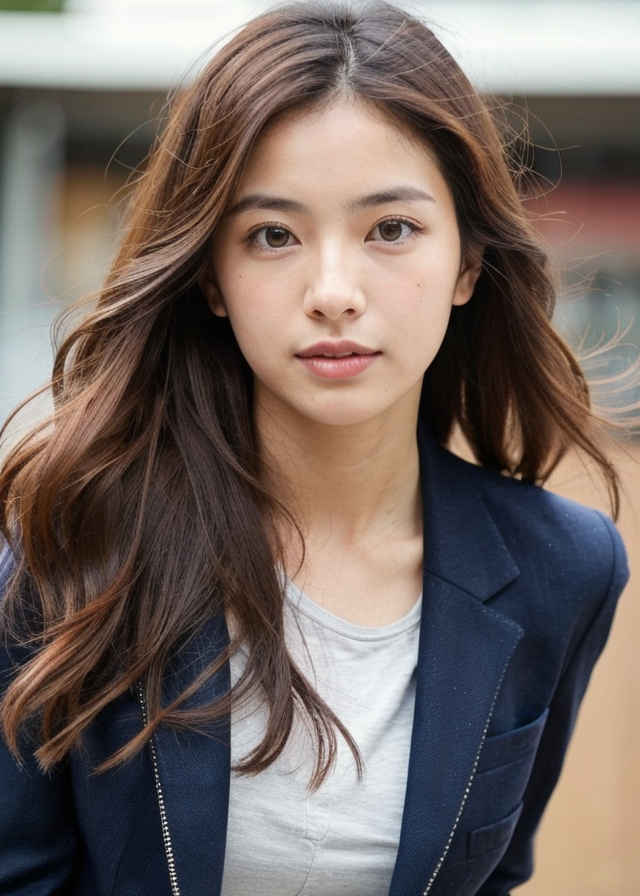 | (顔のクローズアップ、立ち姿の日本人女性のベストアングル写真、ボケ効果、映画のような美しさ) 栗色の長いウェーブヘア、深く窪んだ黒い瞳、そして温かみのある肌色。カジュアルでありながらシックなブレザー、グラフィックTシャツ、ジーンズを羽織っています。 | |