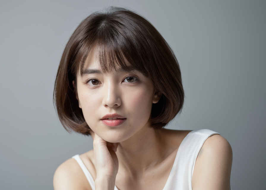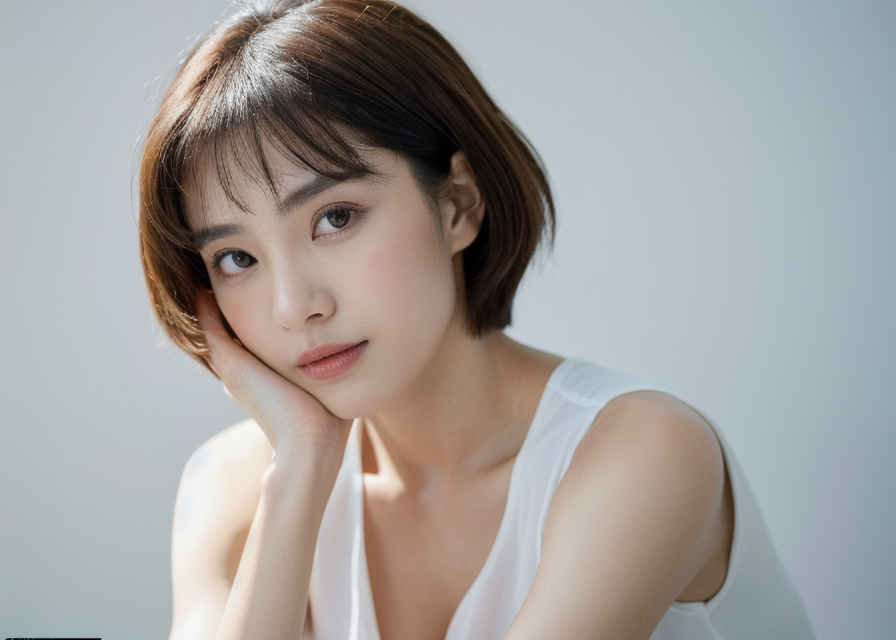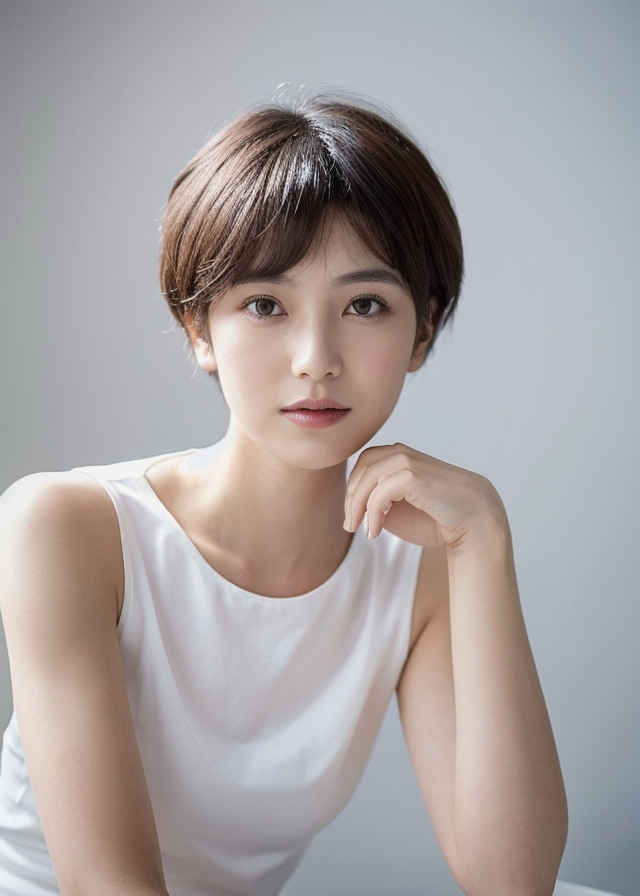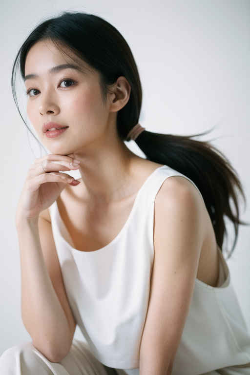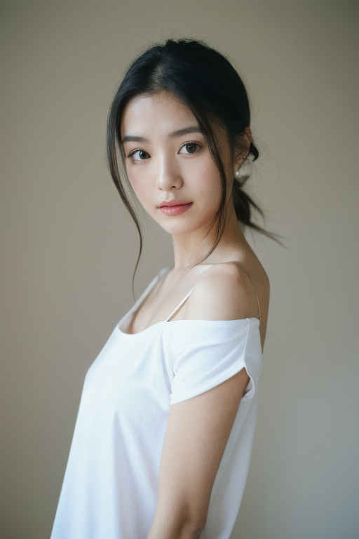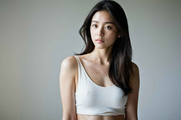| 最高画質、美しい日本人女性1人、白いタンクトップ着用、35mmレンズ、f/1.8、視聴者を見つめる、白背景 | |