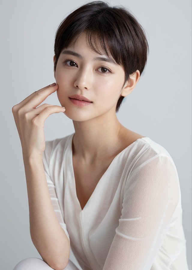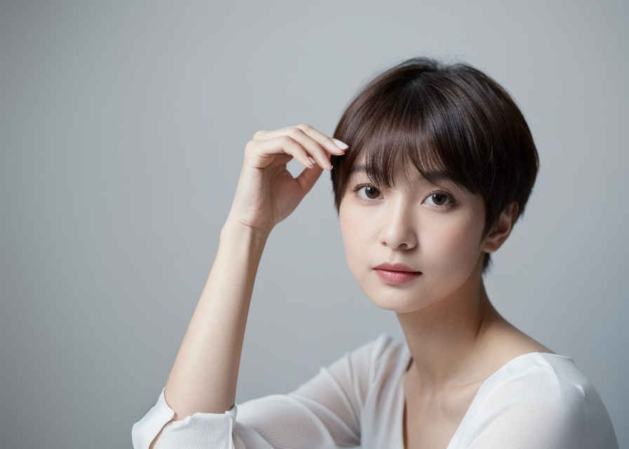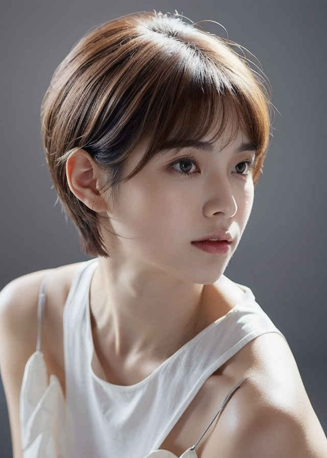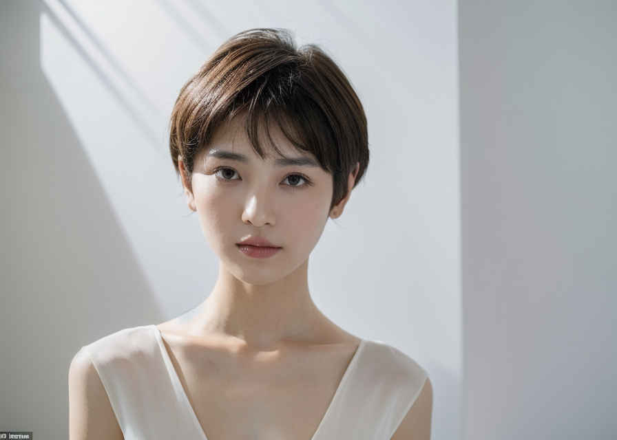 | ショートヘアで白いシャツを着た女性が、白い背景、完璧な顔、人物描写、精密主義の写真のためにポーズをとっている。 | |