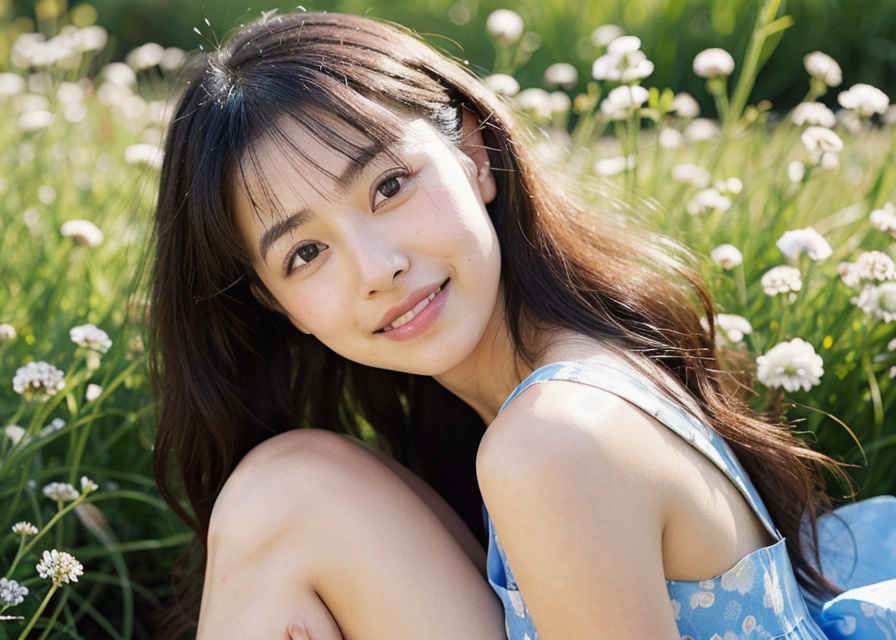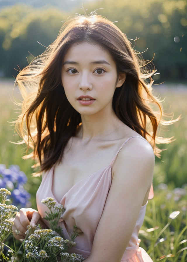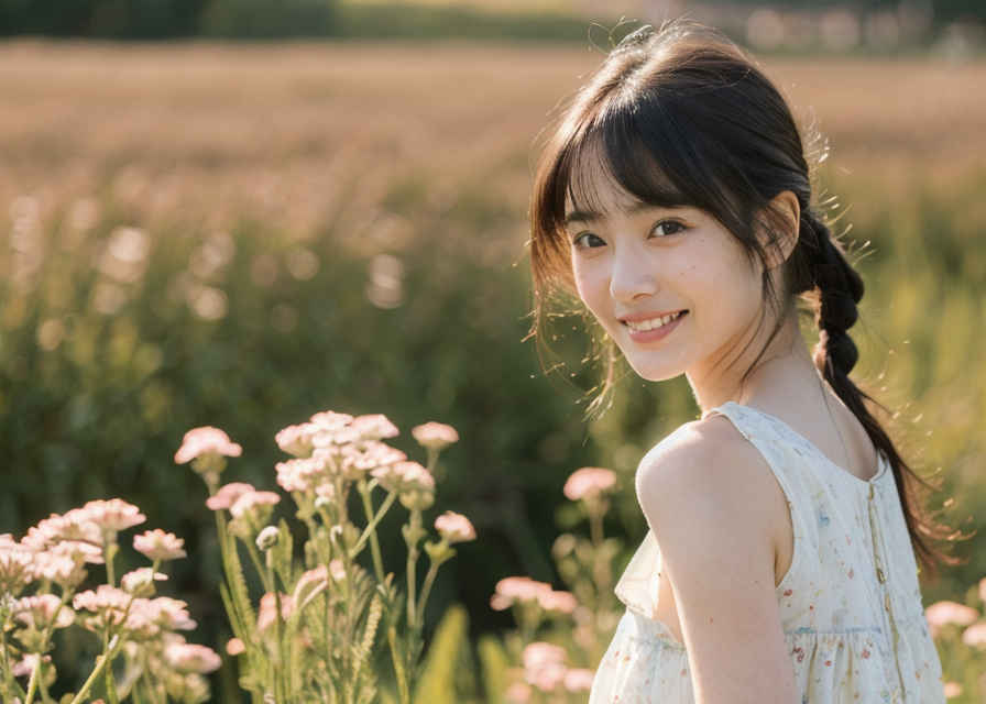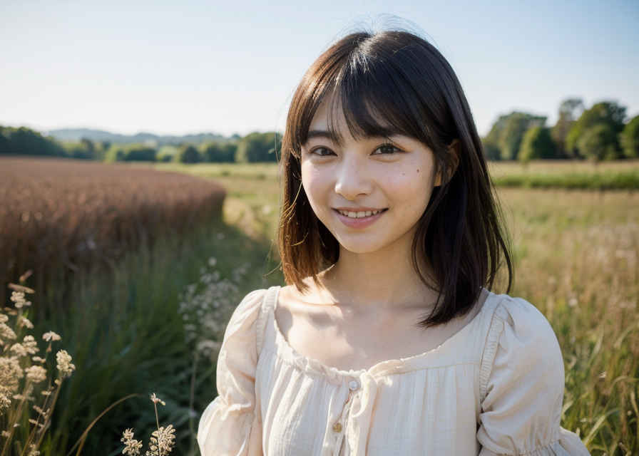| 1人の日本人女性、30歳、かわいい、はにかんだ笑顔、リアルな肌の質感、ロングドレス、顔にフォーカス、顔に当たる光、草原、被写界深度、日光、 | |