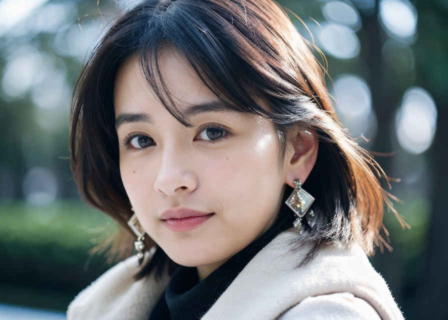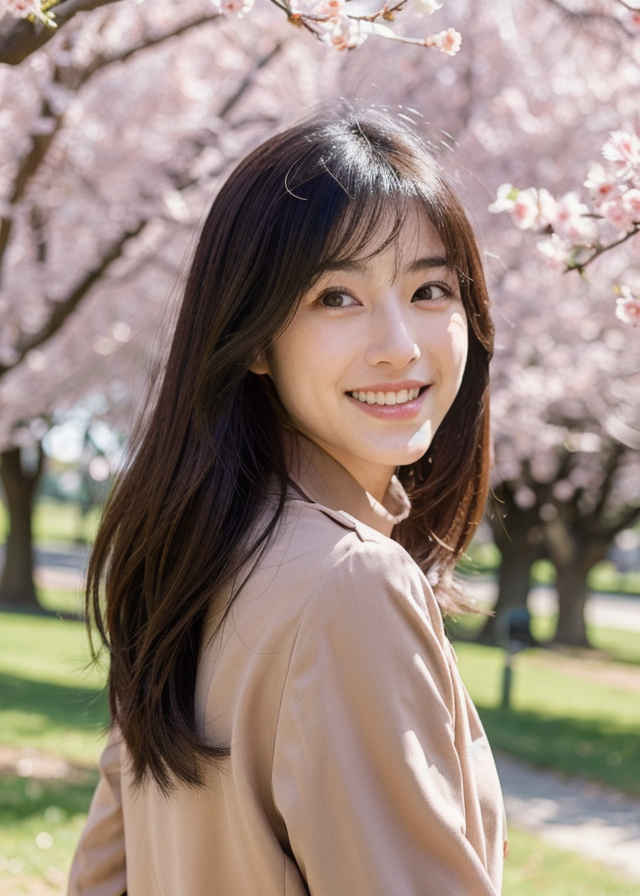 | 日本人女性1人、30歳、美しい顔、リアル、写真、細かい肌の質感、ミドルヘア、上半身、軽い笑顔、ジャケット、シャツ、春、屋外、公園、木 | |