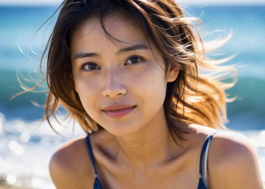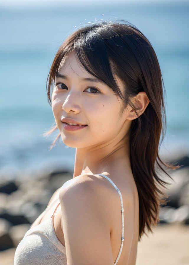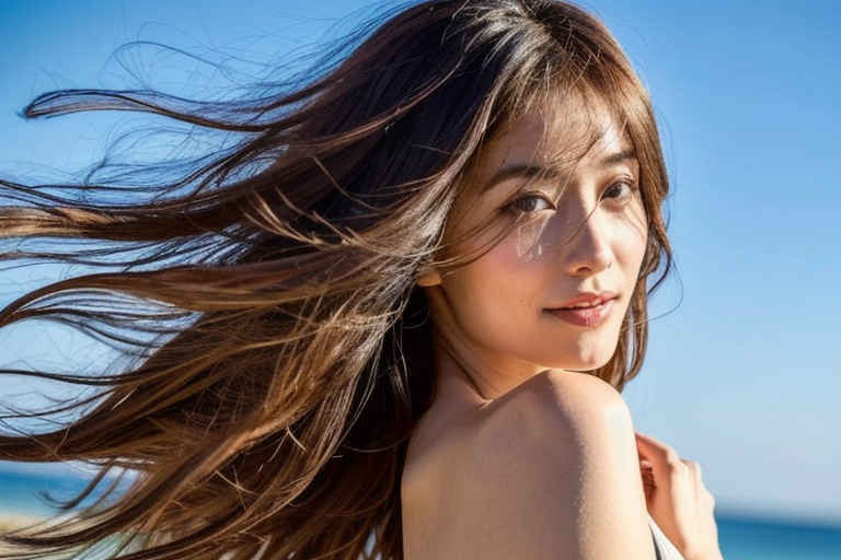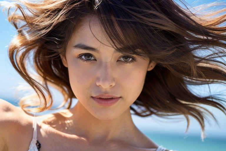 | 最高品質、超高解像度、写実的、視聴者を見つめる、日本人女性1人、30歳、美しい顔、上半身、顔に当たる光、ビーチ、輝く太陽、ビーチ、風、被写界深度、ボケ、 | |