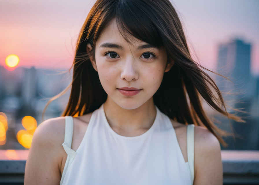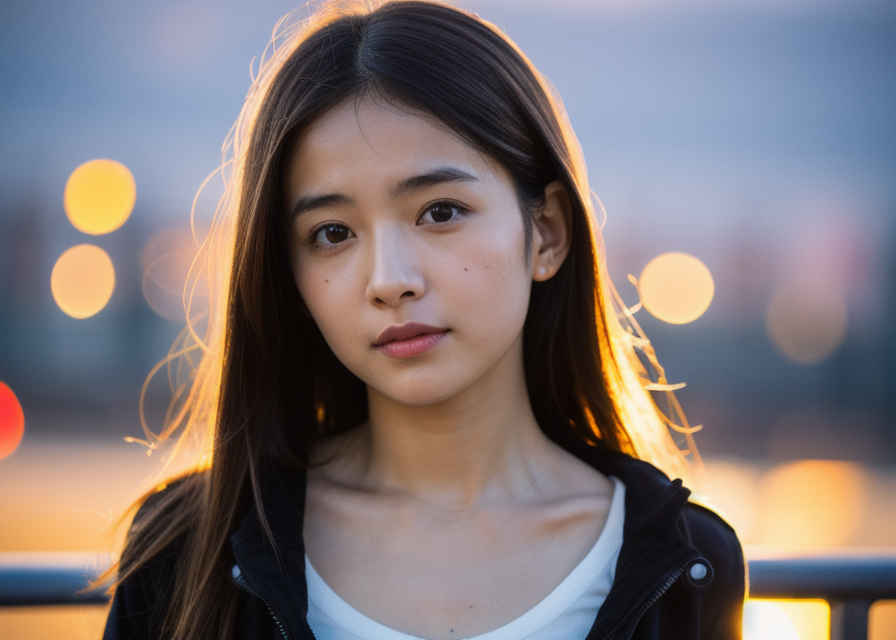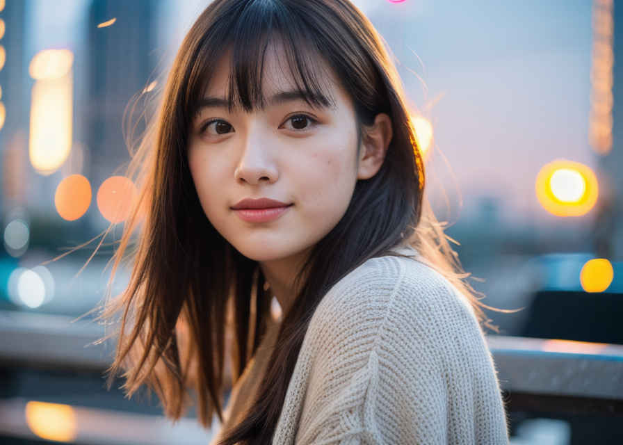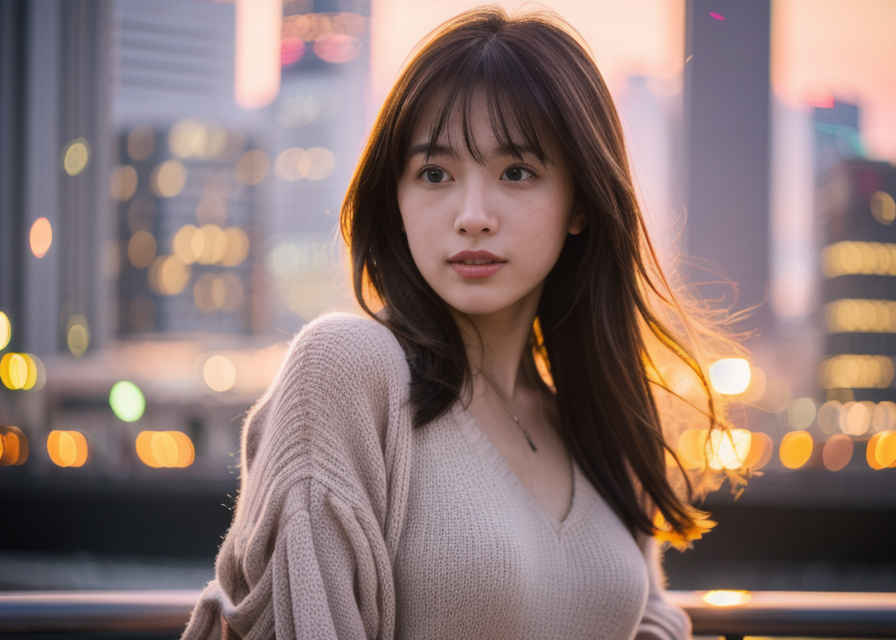 | 最高品質、超高解像度、写実的、視聴者を見つめる、日本人女性1人、美しい顔、上半身、顔に当たる光、都市景観、夕焼け、被写界深度、ボケ、 | |