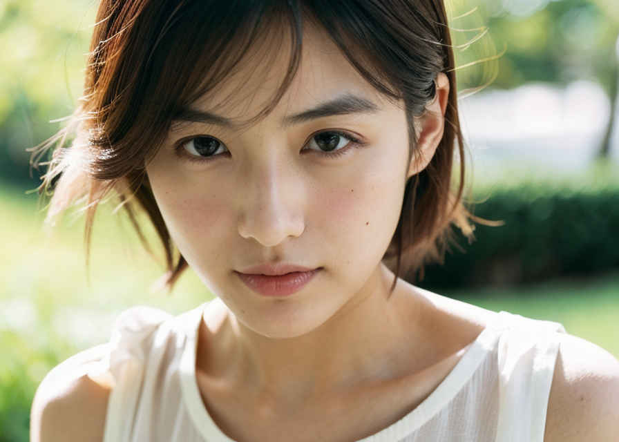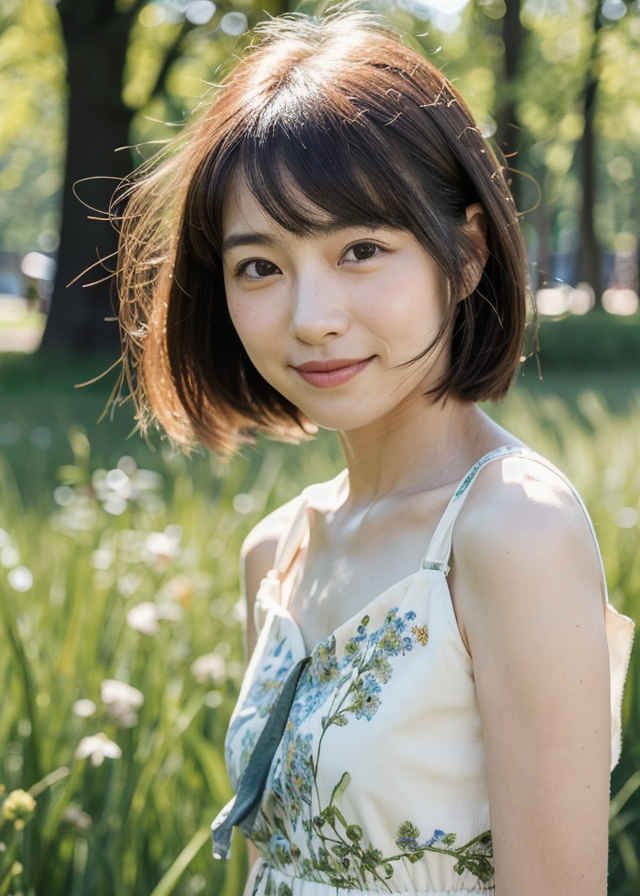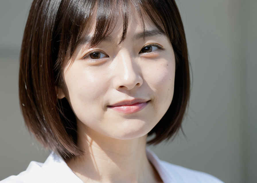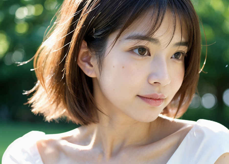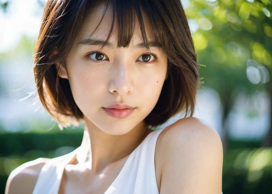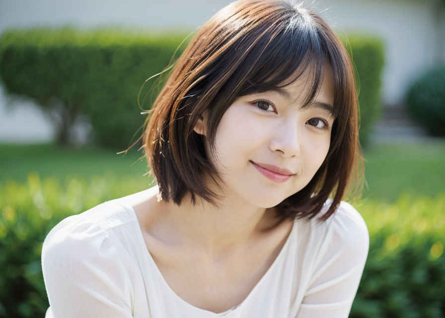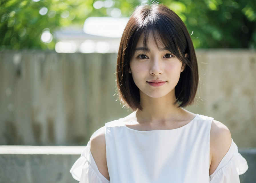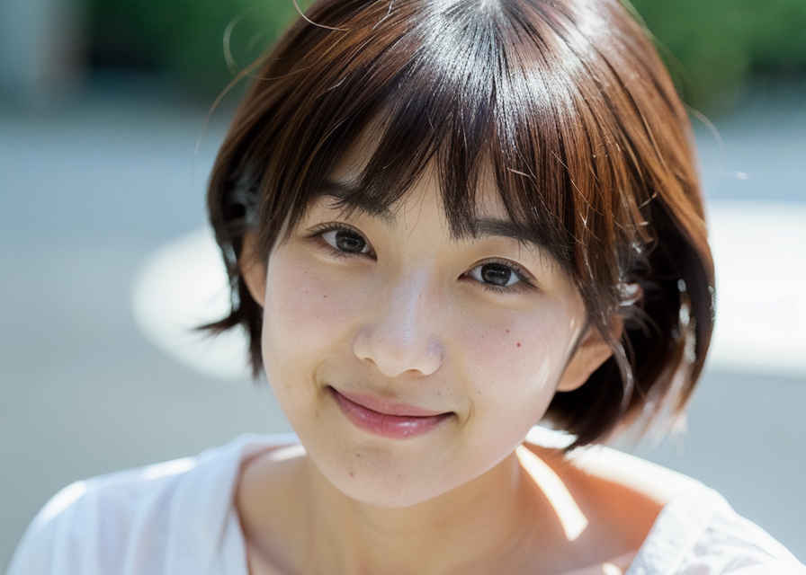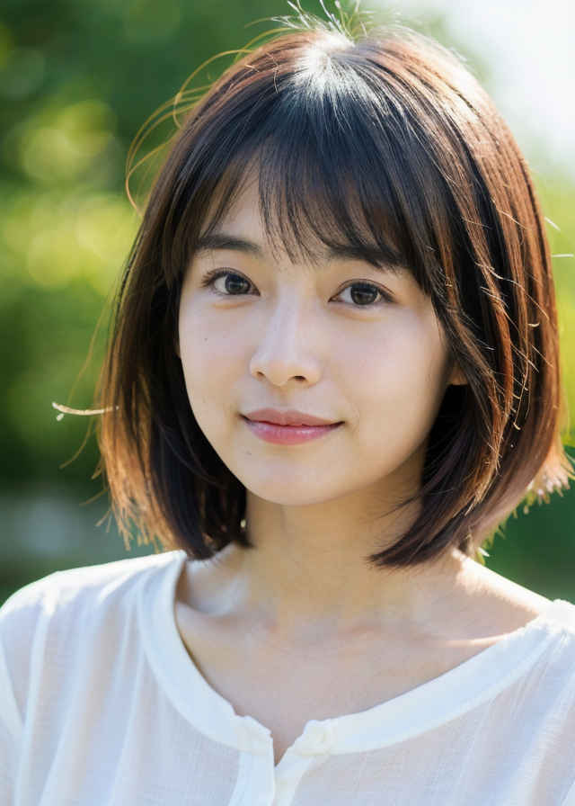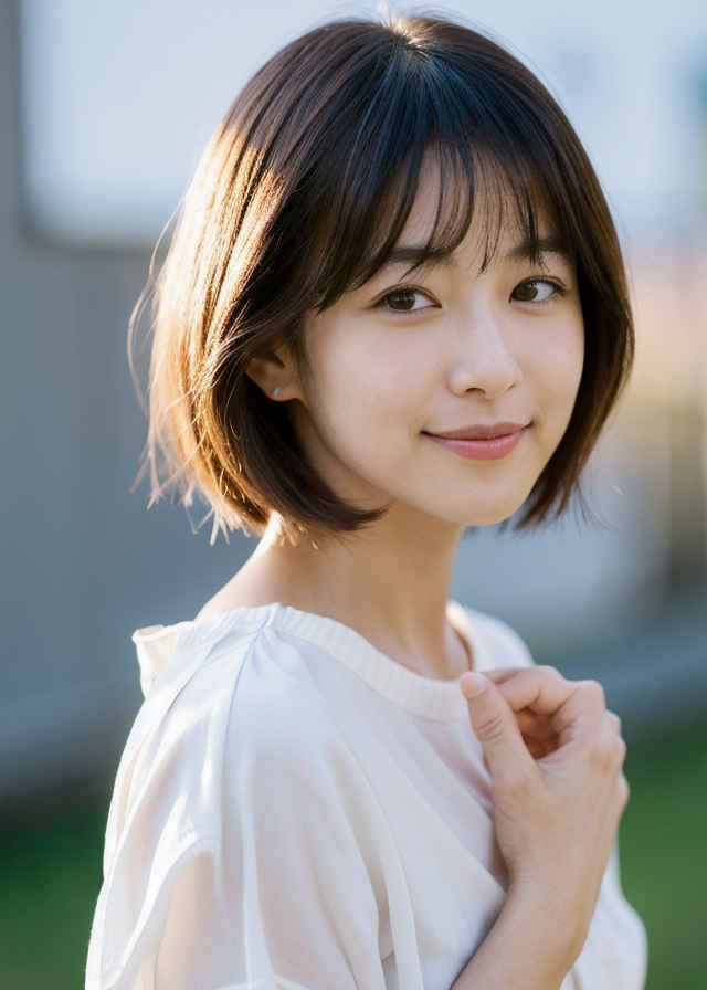 | 日本人女性1名、30歳、美しい顔、はにかんだ笑顔、ショートヘア、リアル、写真、詳細な肌の質感、シャープなフォーカス、顔のフォーカス、白いブラウス、屋外 | |