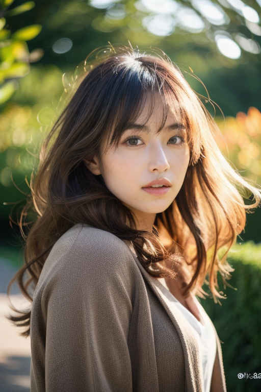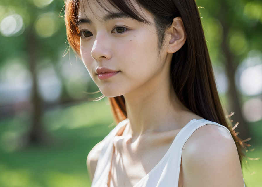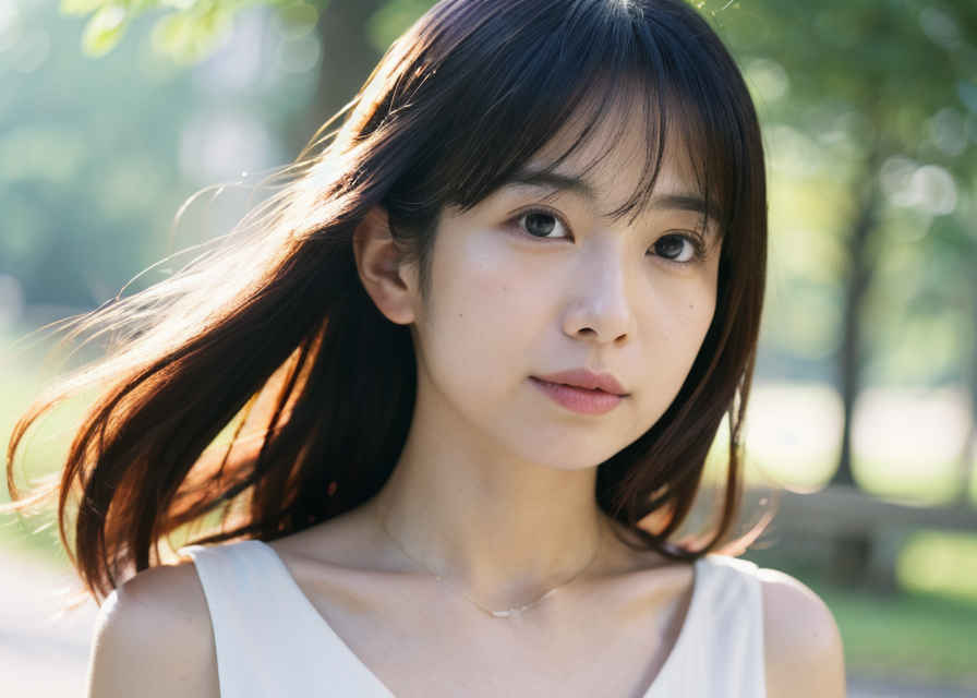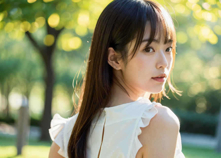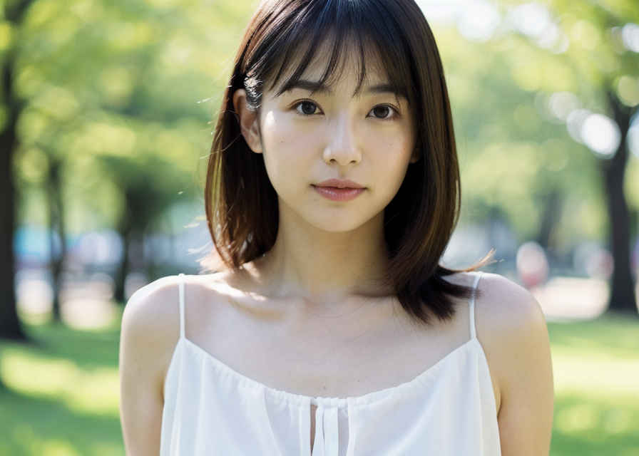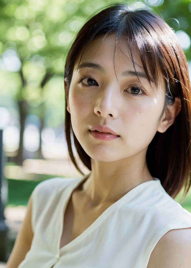 | 日本人女性1人、30歳、美しい顔、リアル、写真、肌の質感の詳細、シャープなフォーカス、上半身、白いブラウス、公園、被写界深度、ボケ、 | |