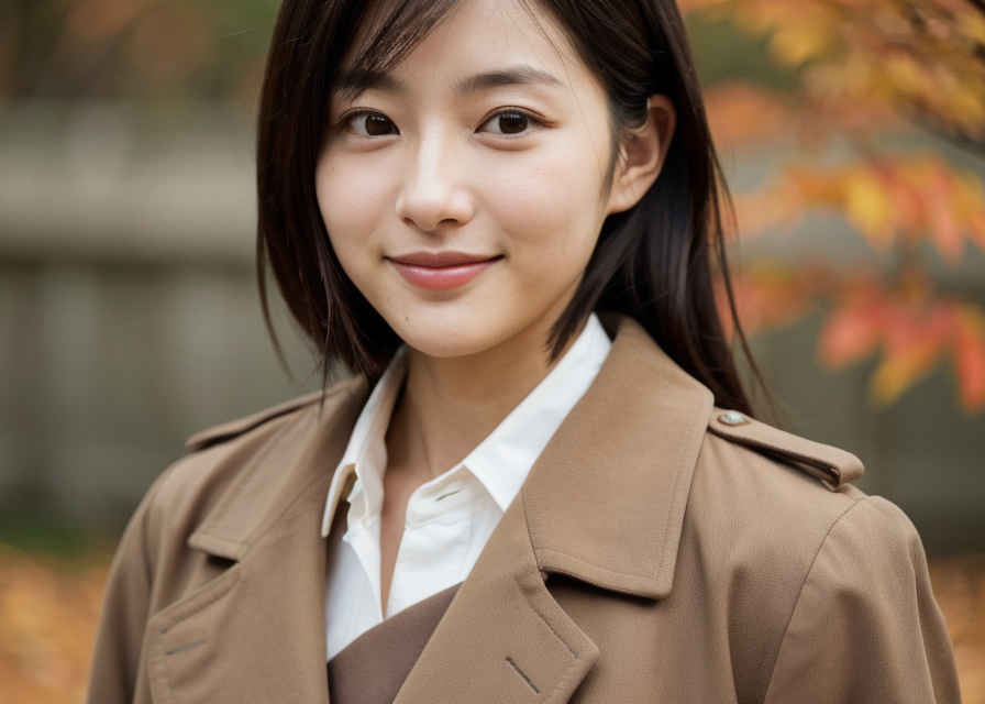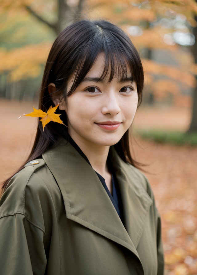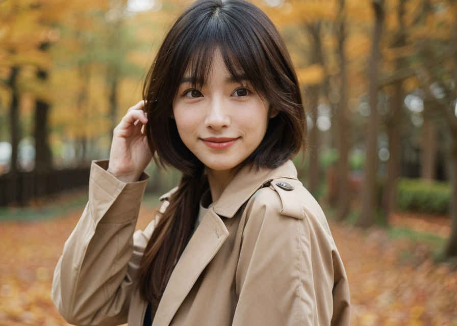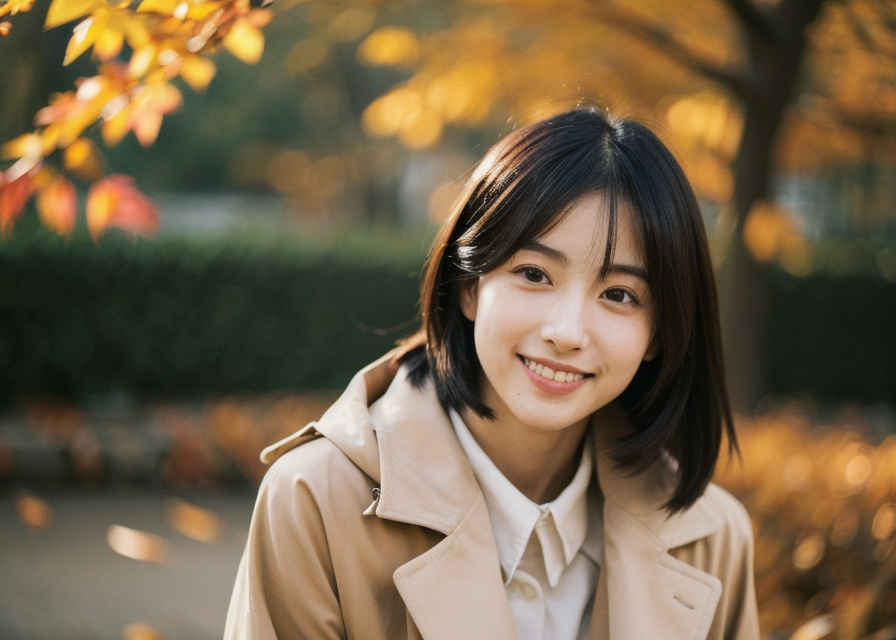 | Prompt ⑪ | 1 japanese woman, 30yo, beautiful face, realistic, photo,, detail skin textures, sharp focus, trench coat, shy smile, border shirt, autumn, outdoor,tree, autumn leaves |