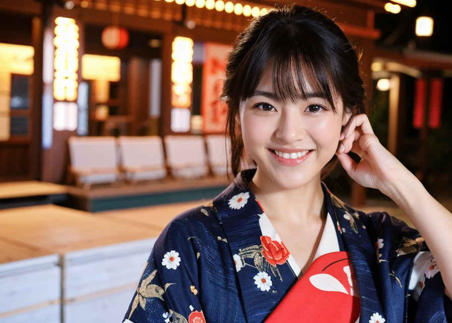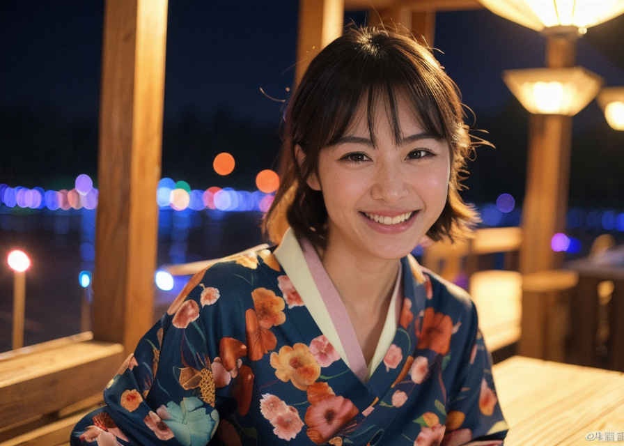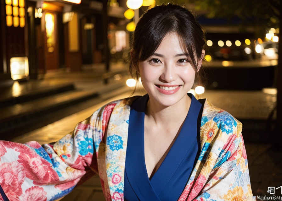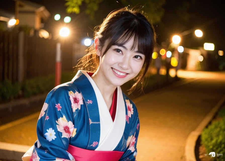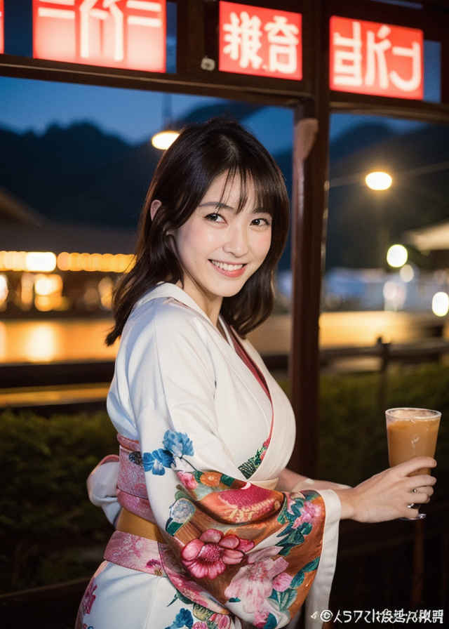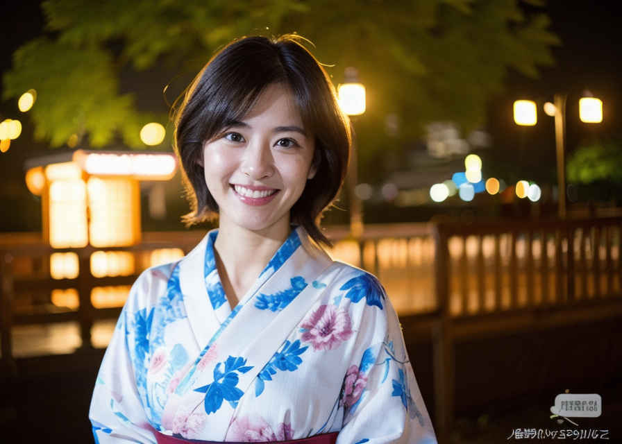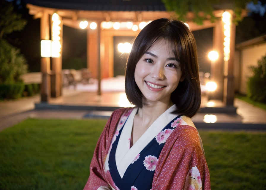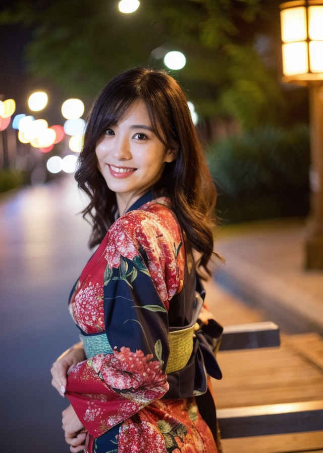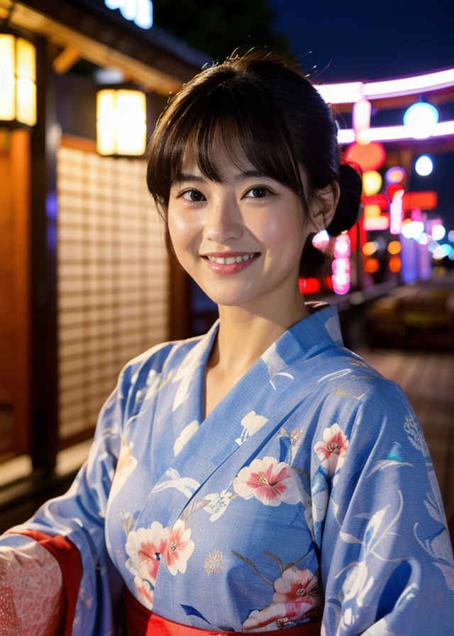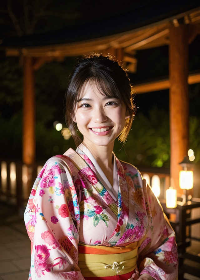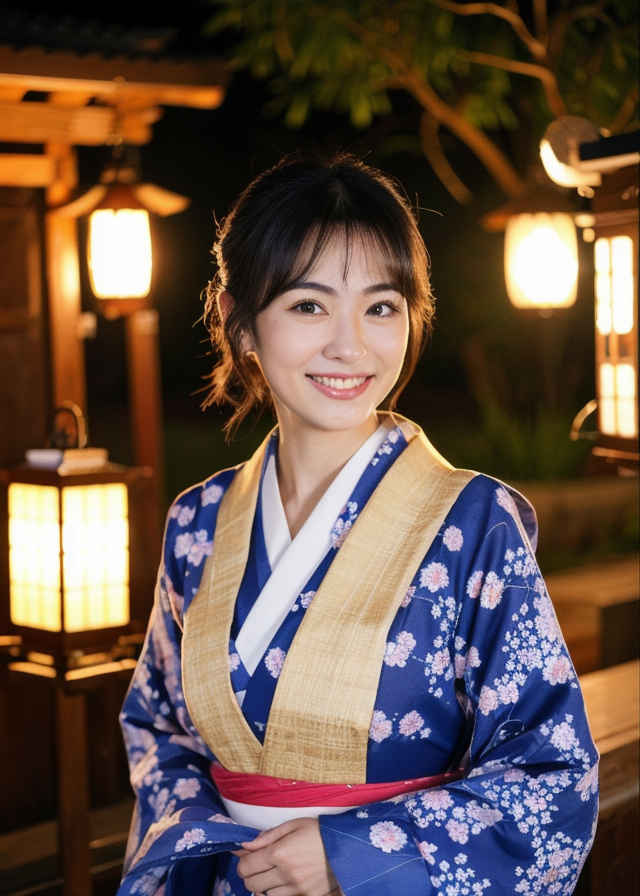 | 写真、最高品質、傑作、リアルな目、美しい日本人女性1人、上半身、笑顔、30代、熟女、着物、屋外、夜 | |