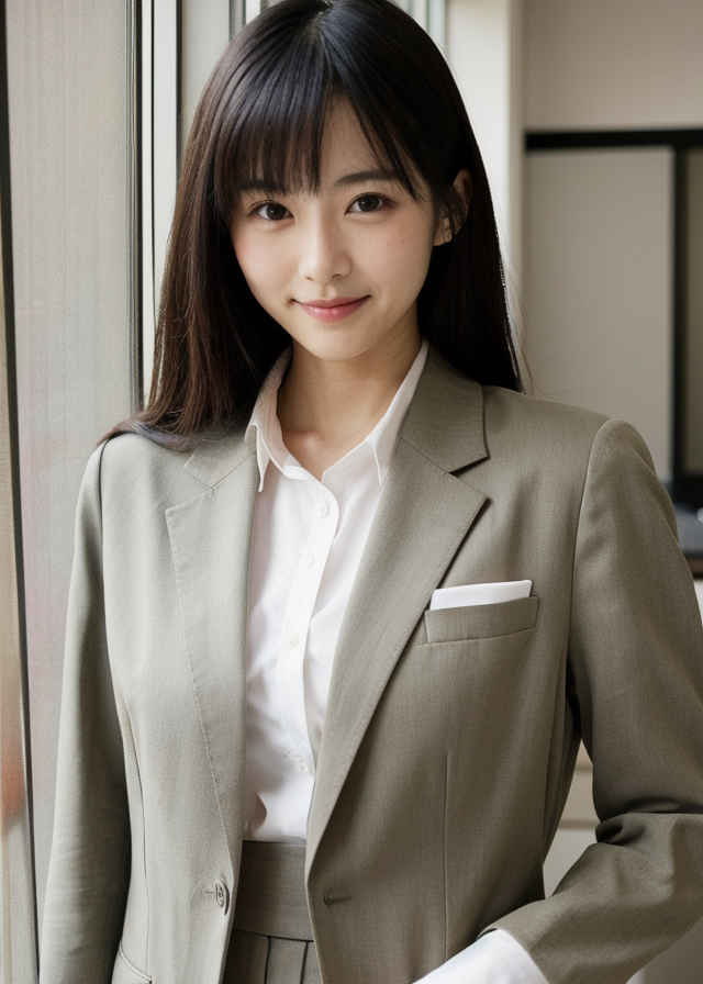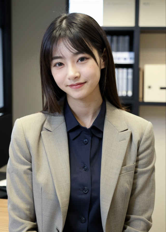 | Prompt ⑮ | 1 japanese woman, cute, shy smile, realistic skin texture, thin button-up shirt, office suit, in the office |