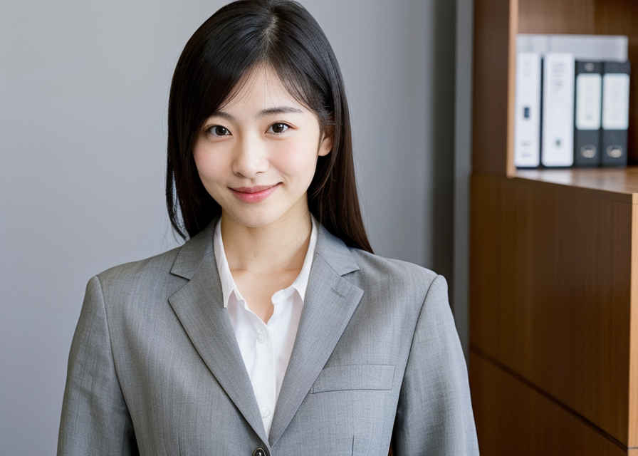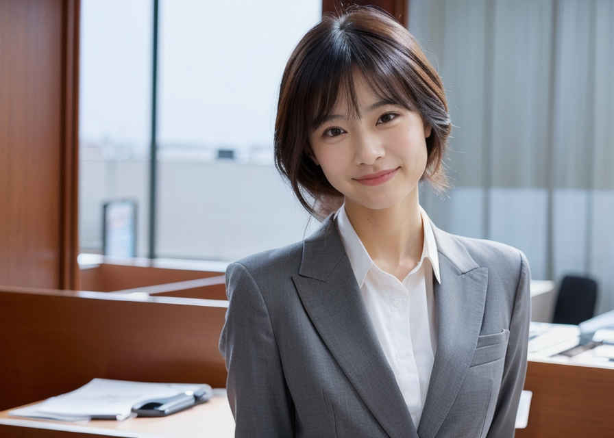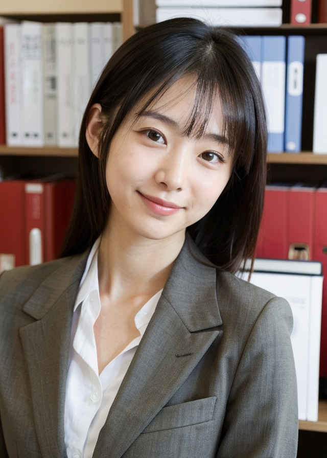 | 1人の日本人女性、かわいい、恥ずかしそうな笑顔、リアルな肌の質感、薄いボタンダウンシャツ、オフィススーツ、オフィスにて | |