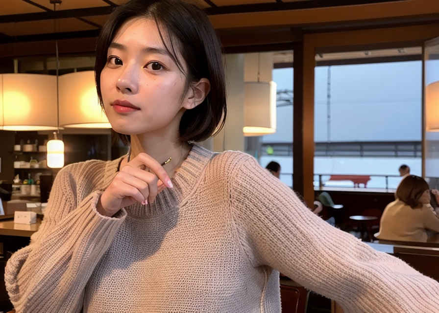 | Prompt ⑯ | 1 japanese woman, 28yo, realistic skin texture, sweater, sunset, woman drinking coffee in a cafe |
