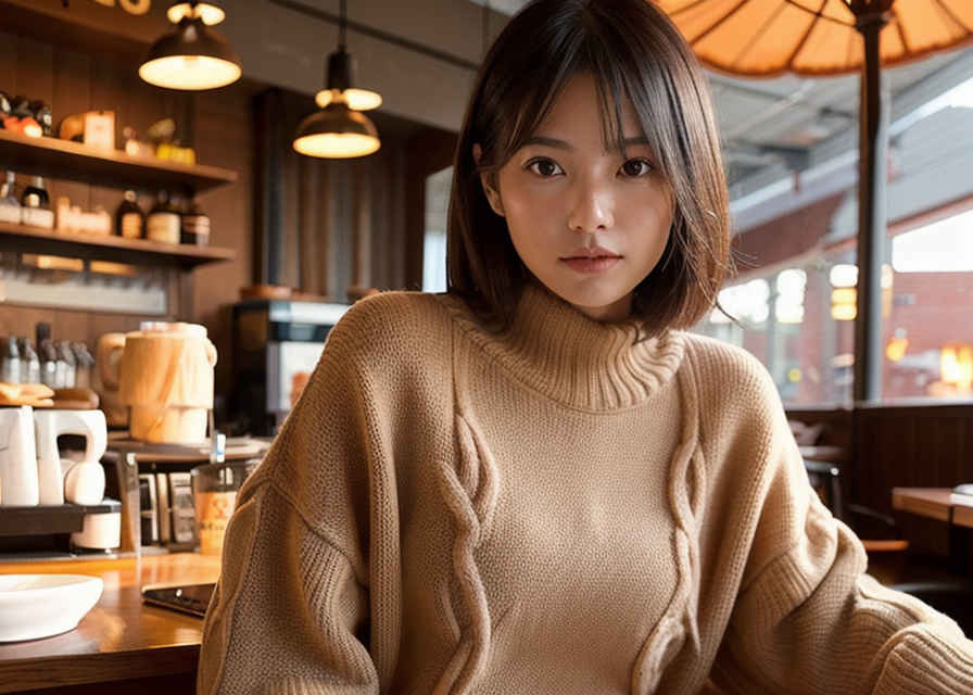 | 30代の日本人女性1人、リアルな肌の質感、セーター、夕日、カフェにて | |