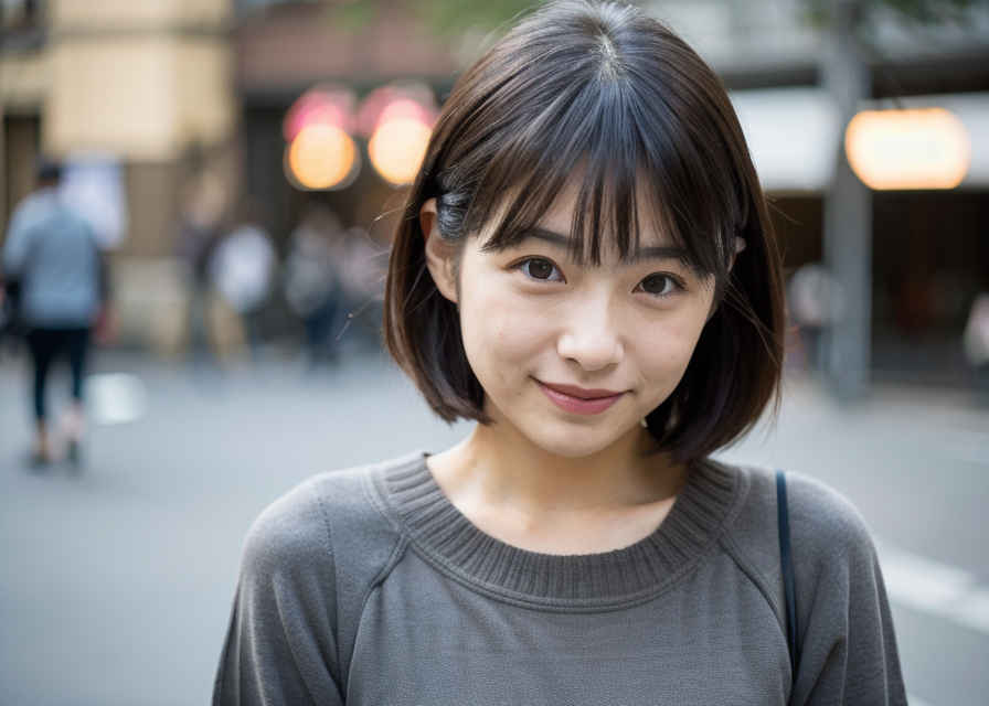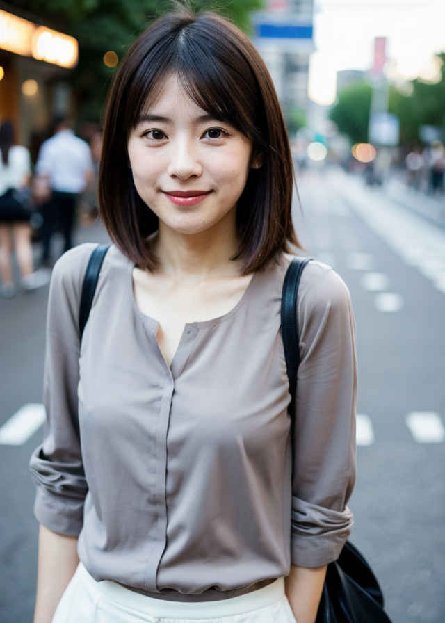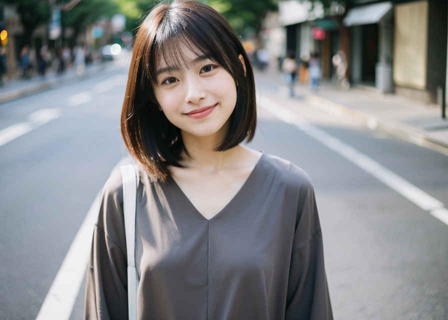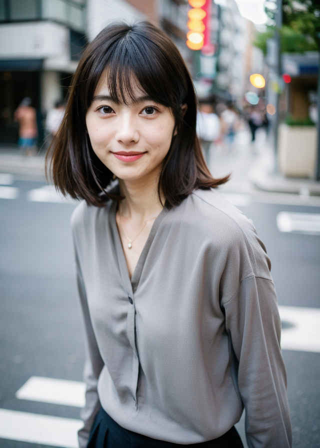| 1人の日本人女性、30歳、かわいい、はにかんだ笑顔、リアルな肌の質感、グレーのブラウス、路上、被写界深度、 | |