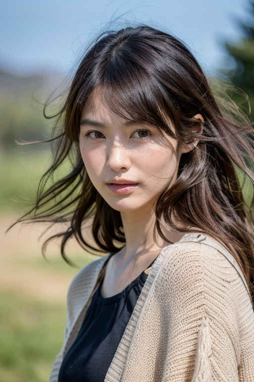 | 高解像度、視聴者を見つめる、日本人女性1人、30歳、美しい顔、ミディアムヘア、顔に焦点を合わせた美しいドレスを着ている、背景は牧草地 | |