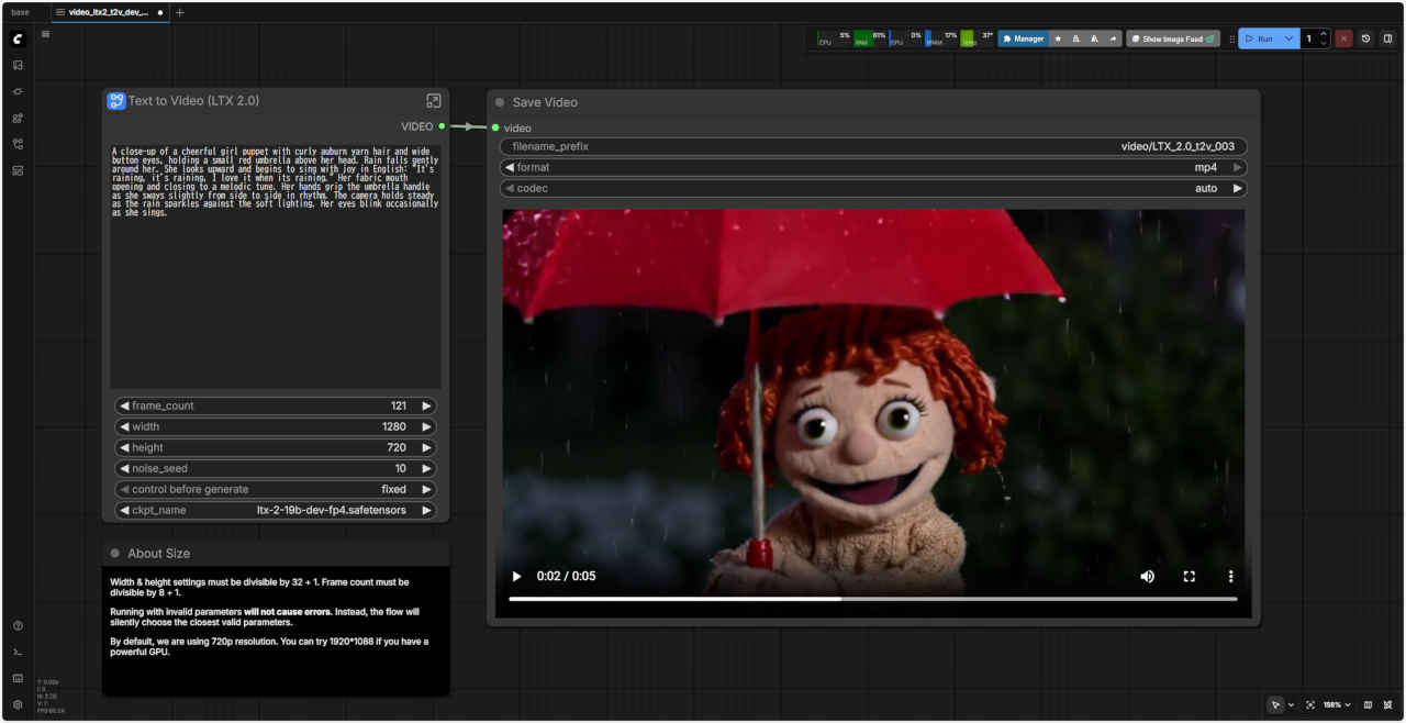 | Prompt: A close-up of a cheerful girl puppet with curly auburn yarn hair and wide button eyes, holding a small red umbrella above her head. Rain falls gently around her. She looks upward and begins to sing with joy in English: "It's raining, it's raining, I love it when its raining." Her fabric mouth opening and closing to a melodic tune. Her hands grip the umbrella handle as she sways slightly from side to side in rhythm. The camera holds steady as the rain sparkles against the soft lighting. Her eyes blink occasionally as she sings. |