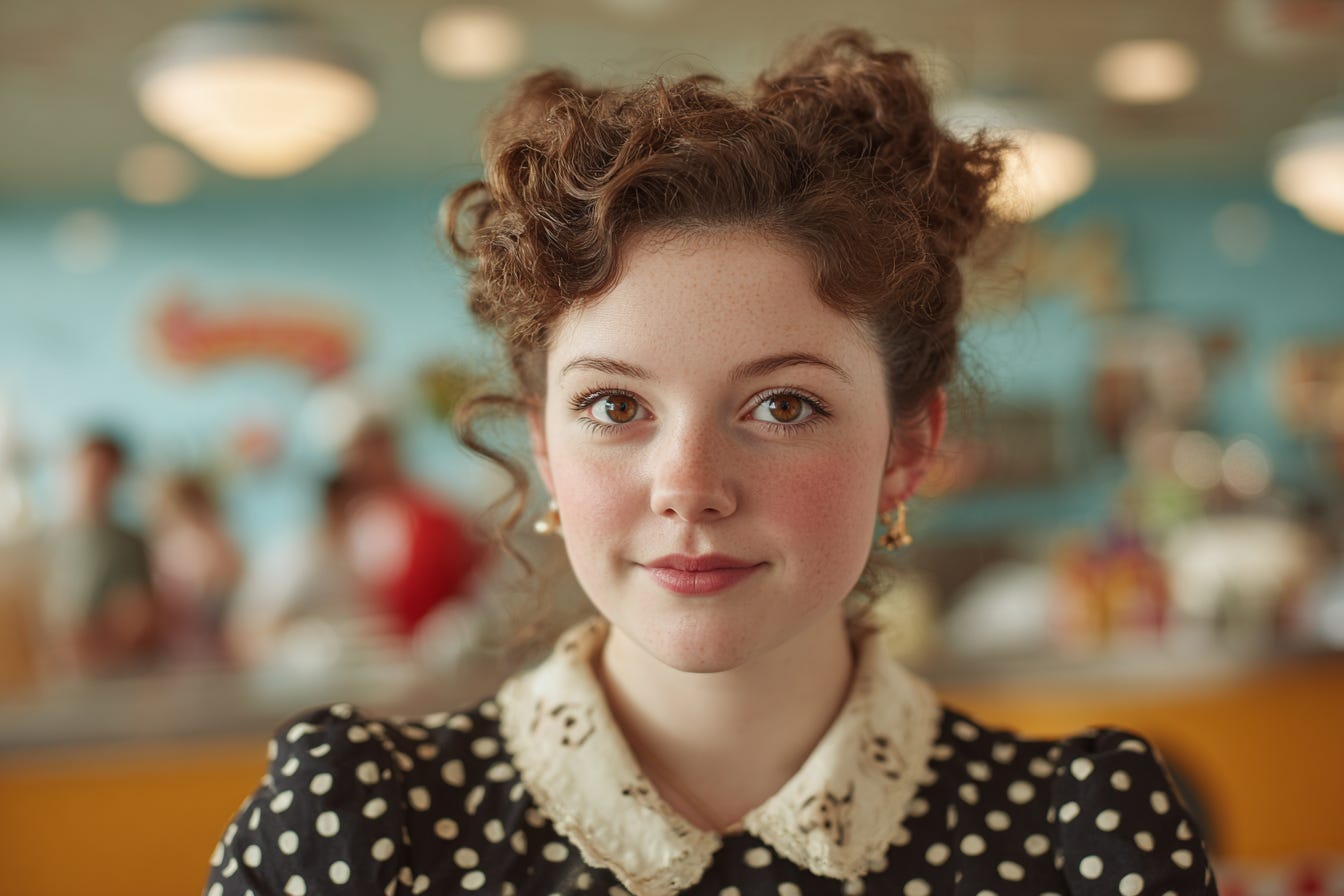 | 1950年代のレトロなダイナーで、若いウェイトレスのクローズアップショット。温かみのある茶色の瞳が、優しい微笑みを浮かべながらカメラを見つめている。彼女はエレガントなクリーム色のレースの襟が付いた黒い水玉模様のドレスを身にまとい、赤みがかった茶色の髪は繊細なカールで丁寧にアップスタイルにスタイリングされ、そばかすのある顔を縁取っている。黄色いカウンターの後ろに立つウェイトレスの顔は、天井から差し込む柔らかく温かみのある光で照らされている。カメラは彼女の少し横から撮影を始め、徐々に顔に近づいていき、ほのかなバラ色の頬を浮かび上がらせている。ぼやけた背景の中で、柔らかな青緑色の壁と赤く輝く「ダイナー」の看板がノスタルジックな雰囲気を醸し出している。皿がぶつかる音、遠くで交わされる会話、そしてジュークボックスの優しい音が辺りを満たしている。彼女は少し首を傾げ、親しみやすく温かい声でこう言った。「ロージーズへようこそ。本日は何をお選びになりますか?」雰囲気は魅力的で時代を超越しており、古典的なアメリカのダイナーの魅力に満ちています。 |