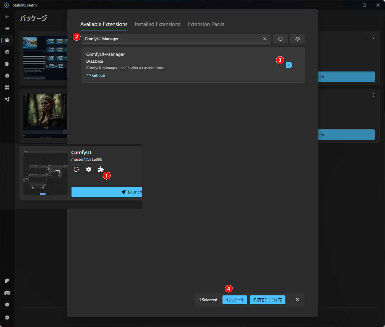 ② ダイアログの検索入力に「ComfyUI-Manager」と入れて出てきたパッケージ ③ にチェックを入れる