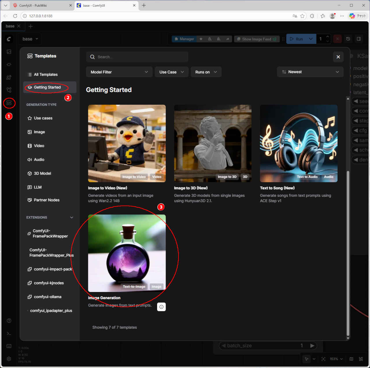 1. 「ComfyUI」の最初の画面からチュートリアル「Getting Started」実行する