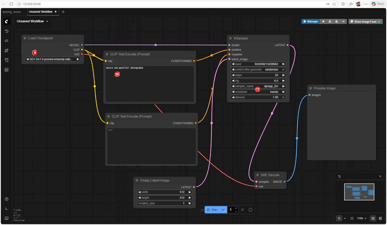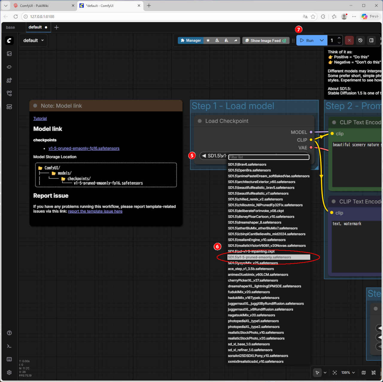 ⑨「Load Checkpoint」ノードでモデルを指定する