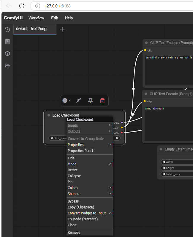 ⑧「Load Checkpoint」ノードの出力を「Clip Text Encode」入力につなぐ