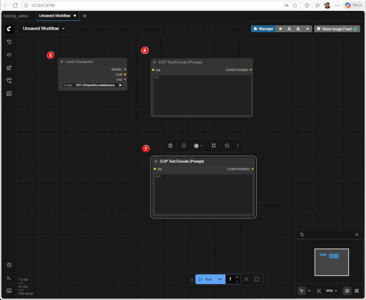 ⑥ 同様の操作で「Clip Text Encode」を配置する