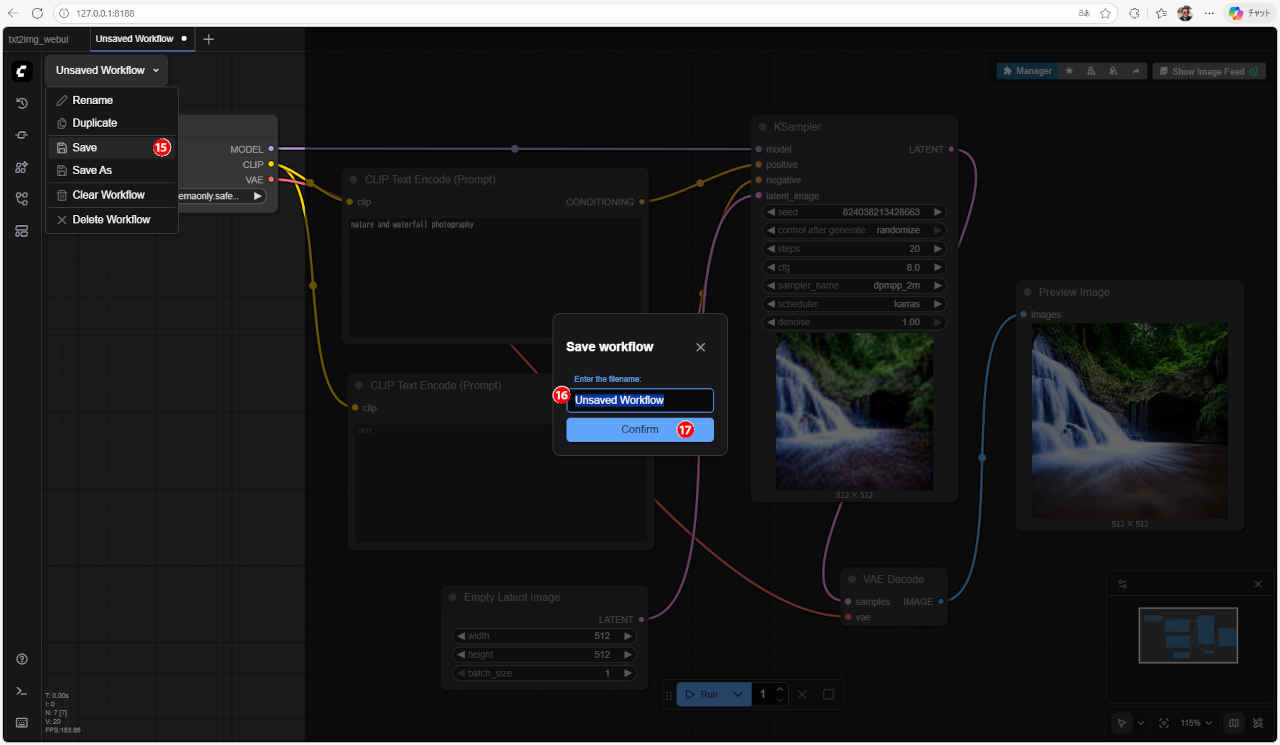 ⑮「Unsaved Workflow」を押しメニューから「Save」または「Save As」を選択