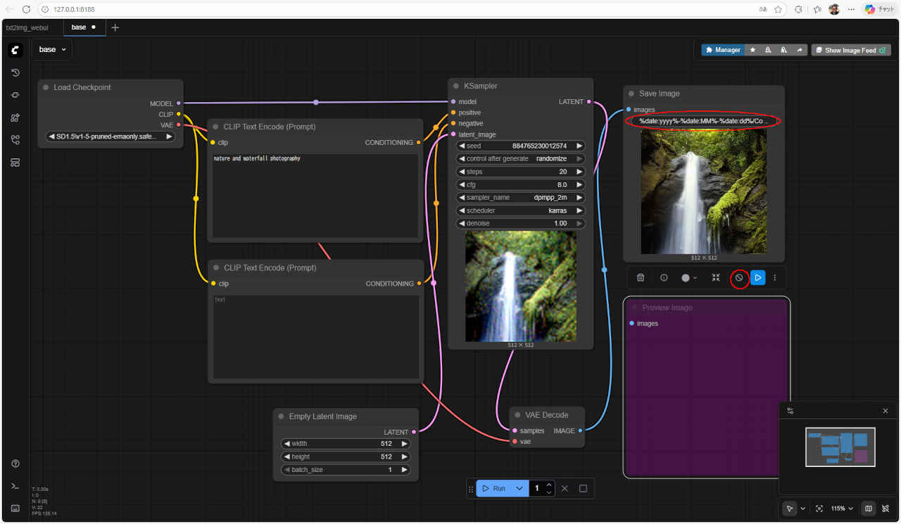 ●「VAE Decode」IMAGE から「Preview Image」image へ