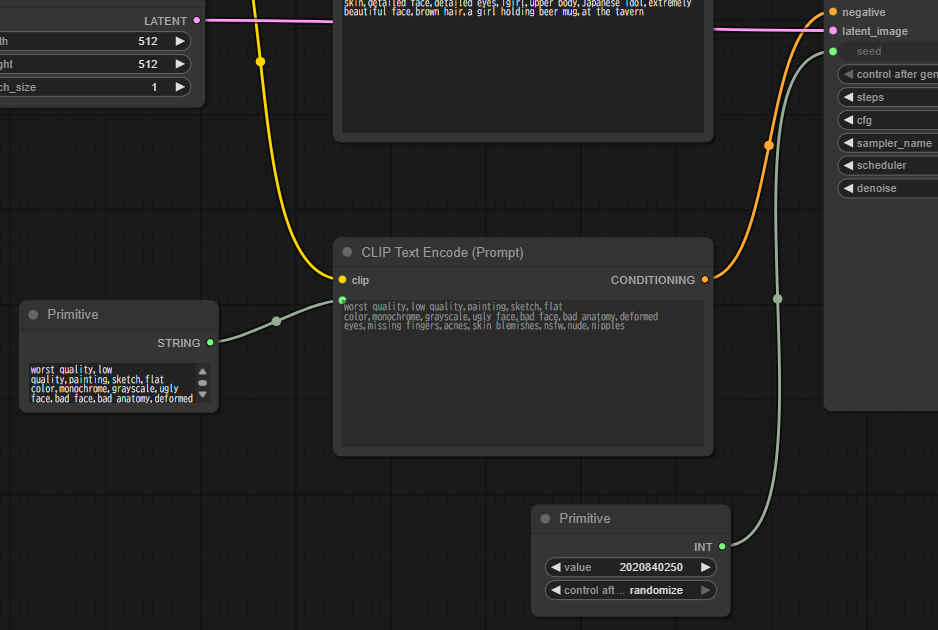 ⑦ ネガティブ・プロンプト用に⑥をコピー&ペーストして「Clip Text Encode」を配置