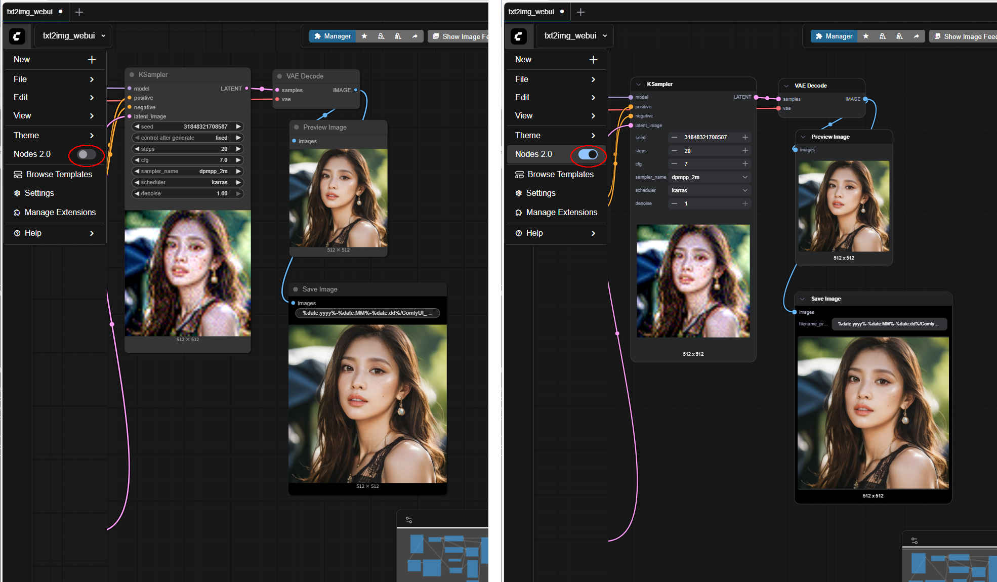 ① 新しい UI の「Nodes 2.0」が追加されたが「seed」値の固定ができないので現状「1.0」を使用する