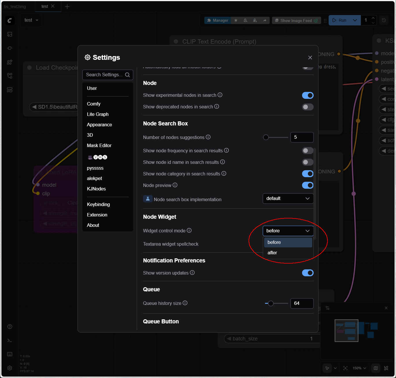 ①「Settings」の「Node Widget」→ Widget control mode を「befor」に設定する