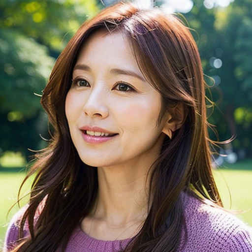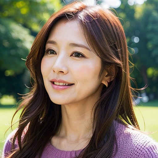 | 背景に木がある日当たりの良い公園の外に立つ、長い茶色の髪を持つ幸せな中年女性のプロフィール写真、デジタルアート |