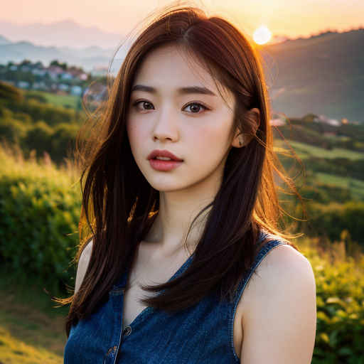 | 傑作、最高品質、超高解像度、非常にリアル、女の子 1 人、美しい女性 1 人、ビューアを見る、タンクトップ、上半身、背景の山、美しい夕日、美しい目、詳細な目、詳細な髪、顔の光、 |