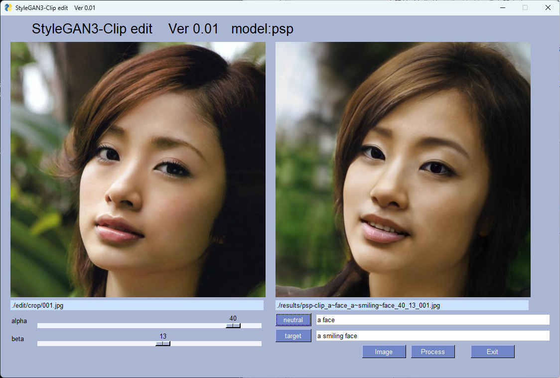 (py38_learn) python demo.py ------------------------------ | AI sample program (CPU) | Ver 0.02 ------------------------------ # conda environments: # base C:\Users\izuts\anaconda3 py38_learn * C:\Users\izuts\anaconda3\envs\py38_learn py38_learn_test C:\Users\izuts\anaconda3\envs\py38_learn_test Select input? 0 - 9 'enter'=終了 0: fase_pasing メークアップをシュミレーション 1: DLFS 人間の年齢による顔の変化 2: encoder4editing StyleGANを使った画像編集 3: CycleGAN 画像スタイル変換 4: stargan-v2 顔の合成 5: QMUPD 似顔絵生成 6: PAMA 画像に別の画像のスタイルを転送(静止画) 7: PAMA(movie) 画像に別の画像のスタイルを転送(動画) 8: BlendGAN 顔画像に様々なスタイルをブレンドする 9: StyleGAN3 StyleGAN による画像の編集 10: StyleGAN3 StyleGAN + CLIP による画像の編集 ------------------------------ | program end.. | ------------------------------