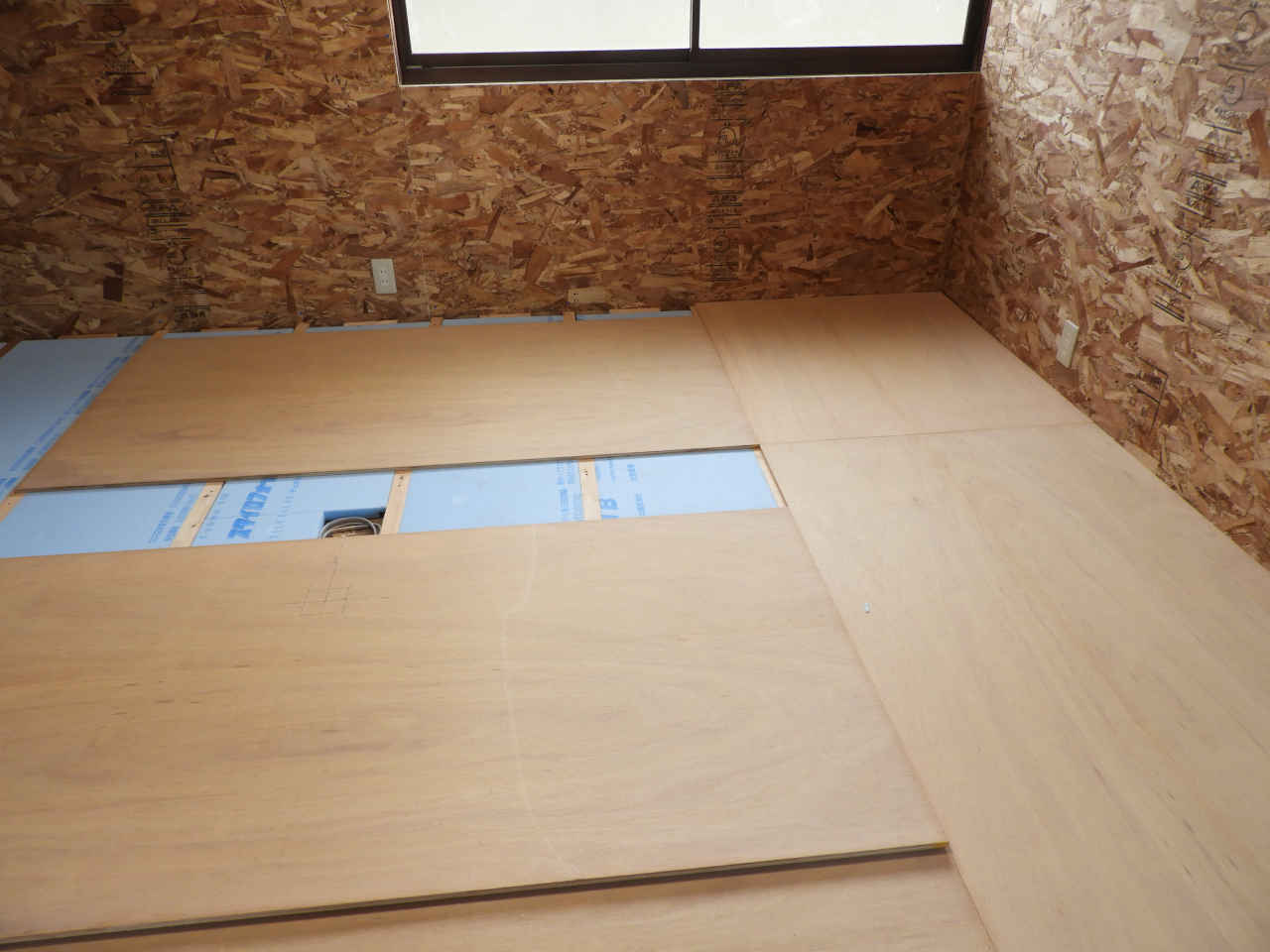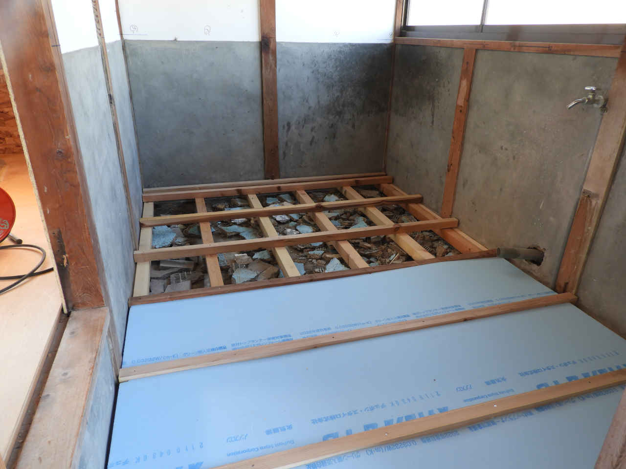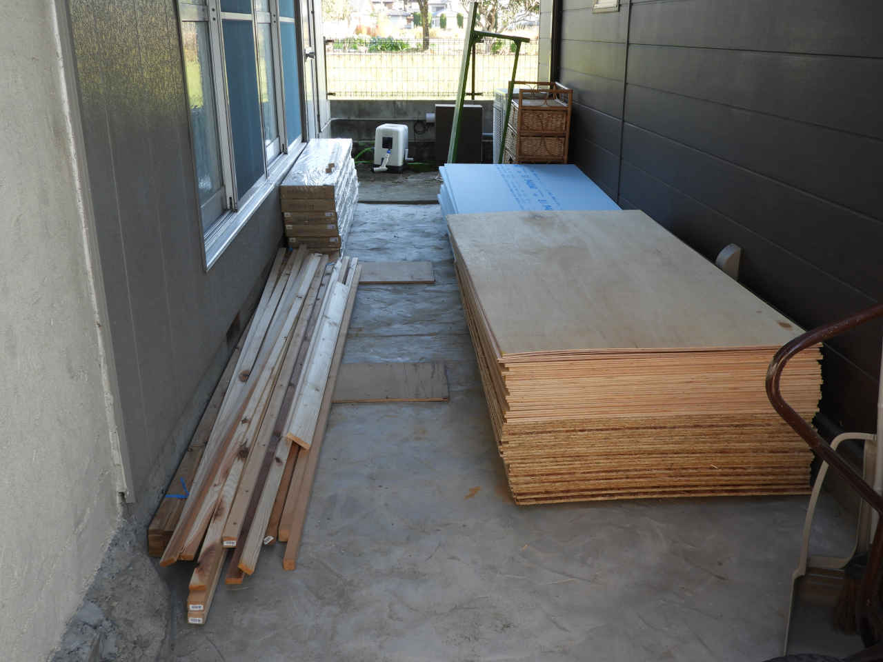 - 角材の間に 30mm厚の断熱材(スタイロホーム)を入れてその上に 12mmのコンパネを貼る。
