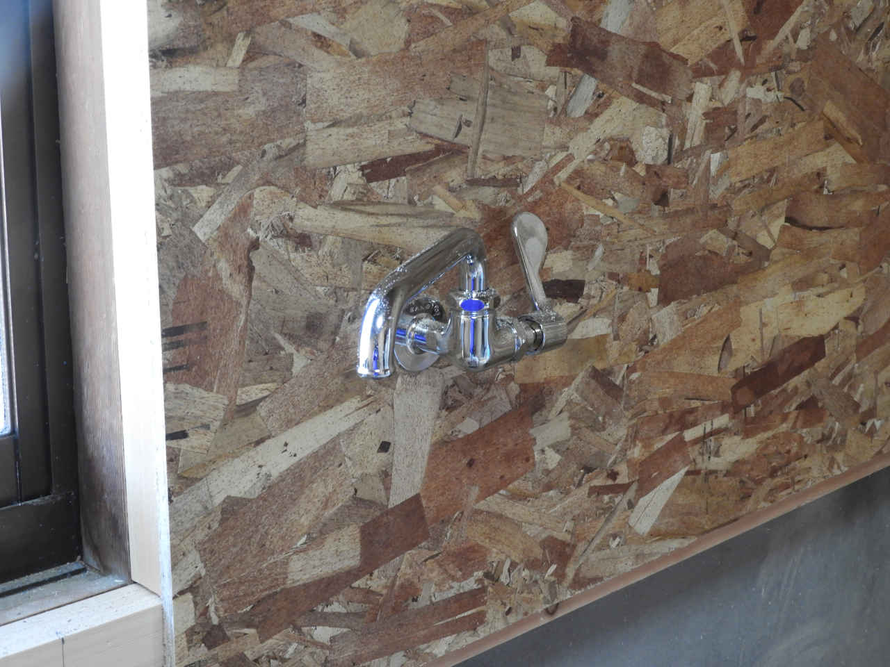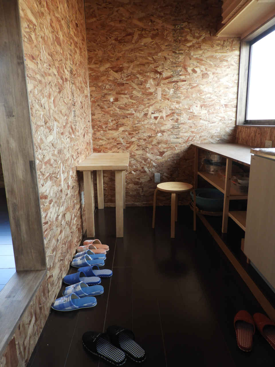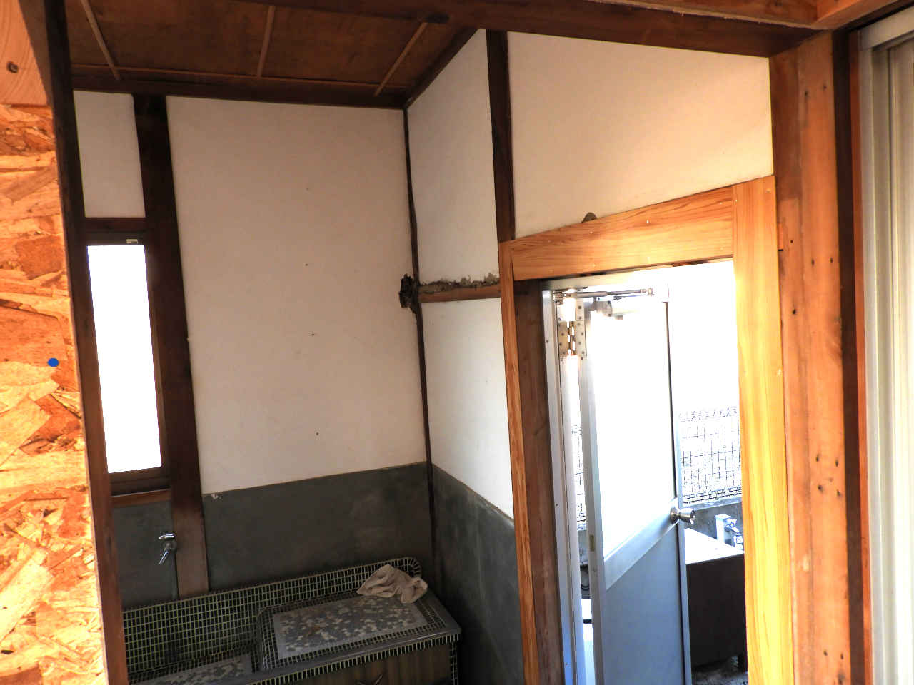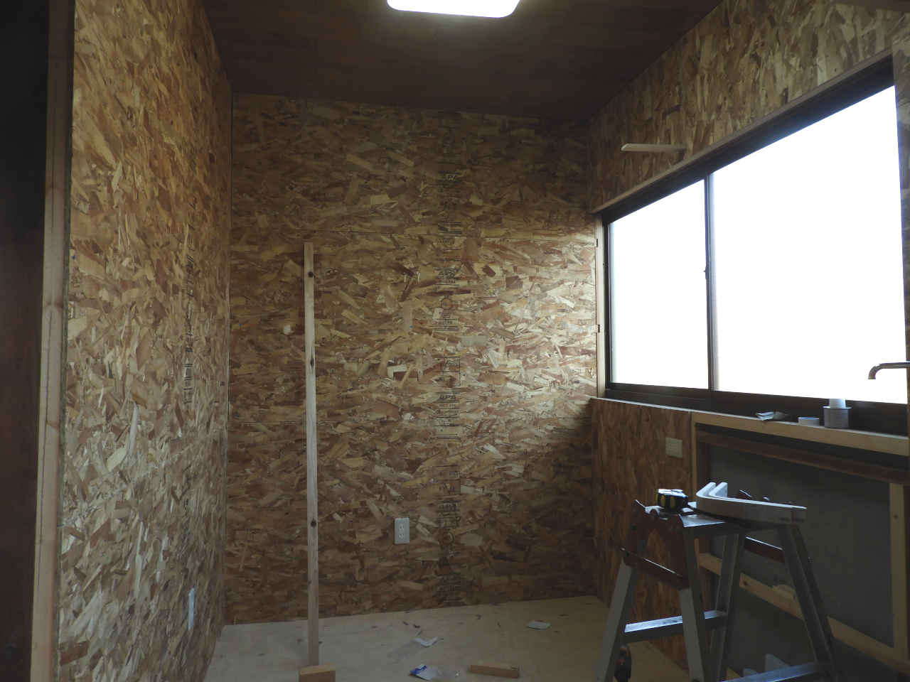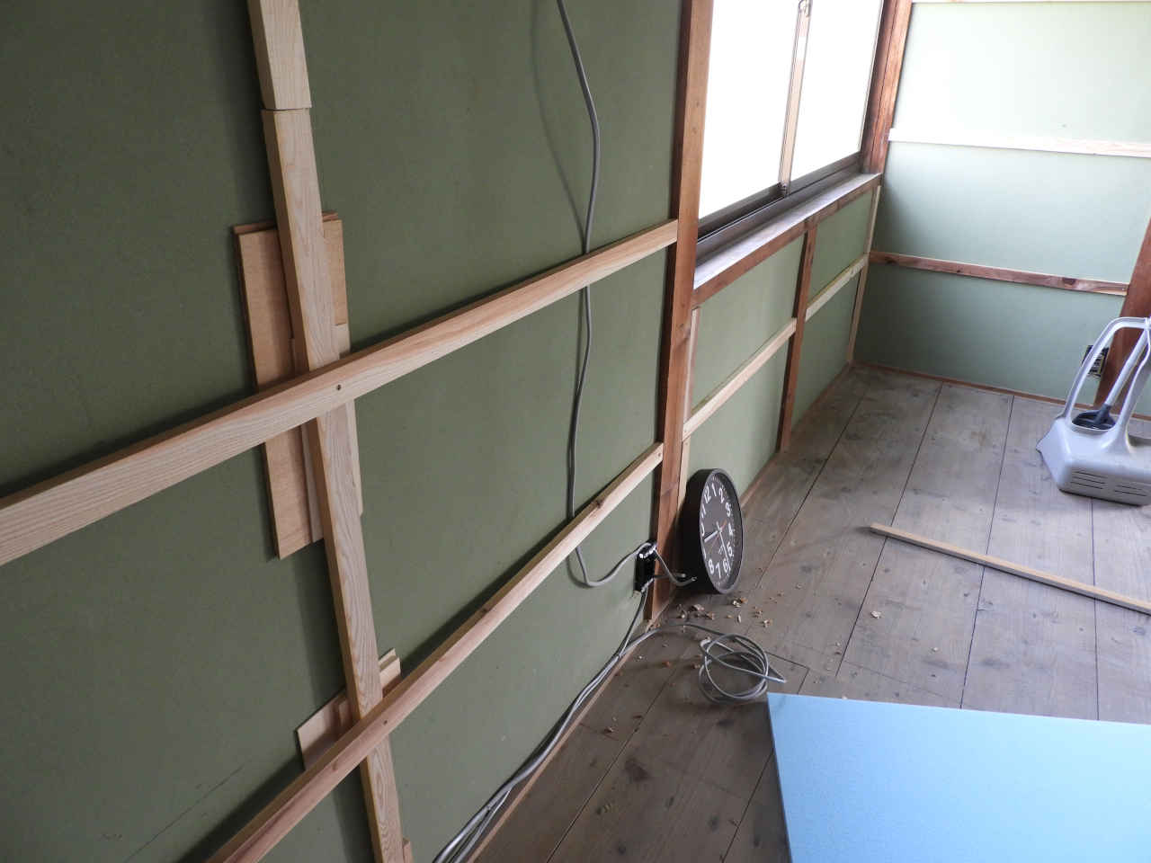 - 土壁と柱の間に角材を455mmピッチに渡して 9mm OSB 合板を貼る。