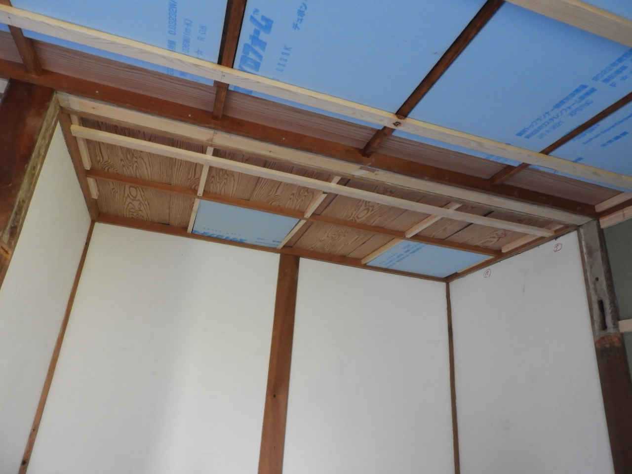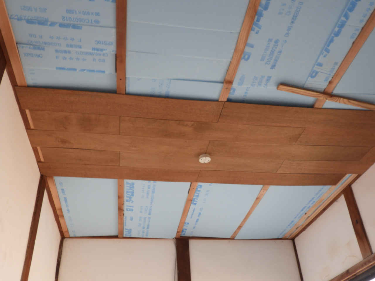 - 釣り天井の淵との段差分の角材を900mmピッチに貼って天井板のガイドにする。隙間にスタイロホームを貼って断熱する。