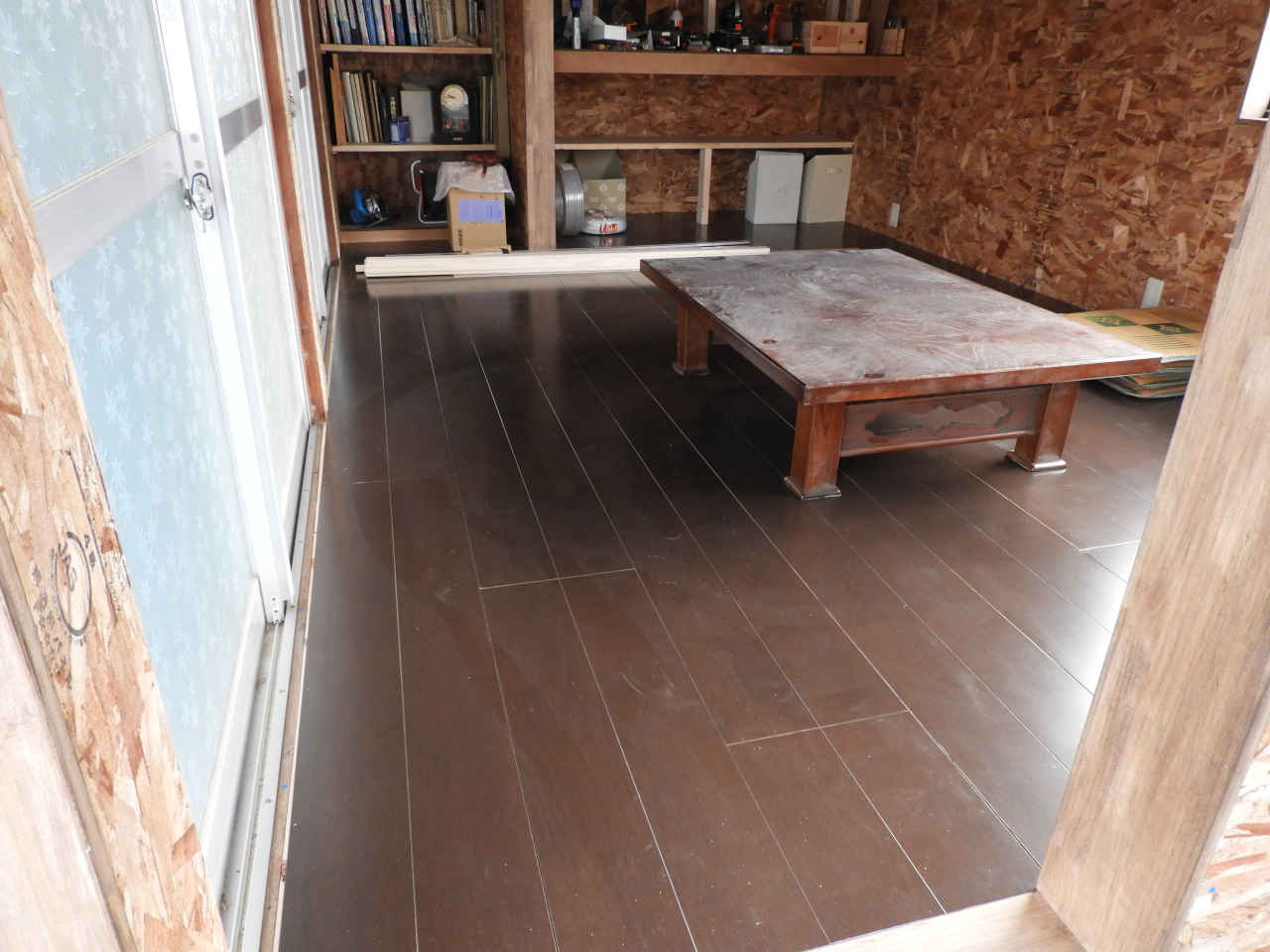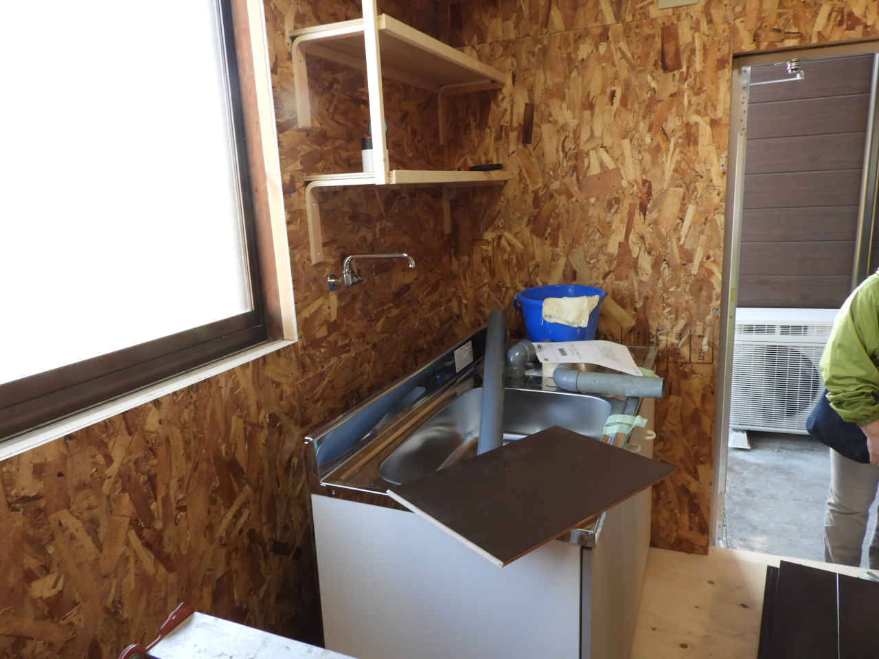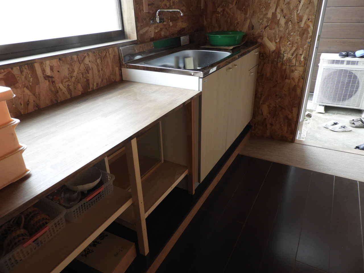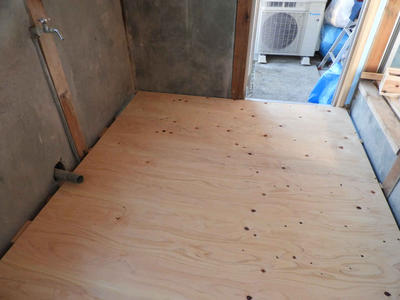 - 排水管の施工のため流し台の下の床を挙げることにする。残り部分はフローリングを貼る。