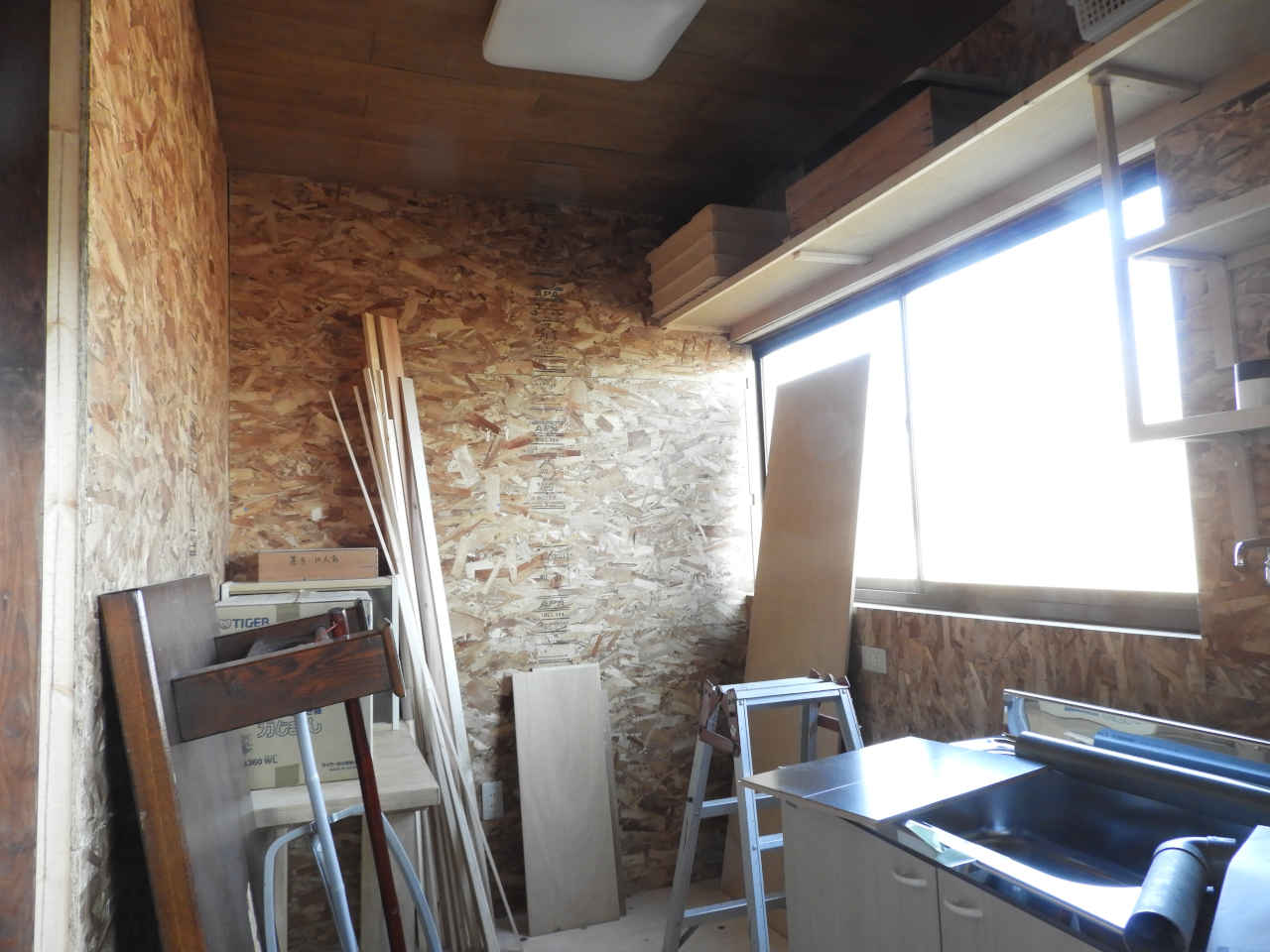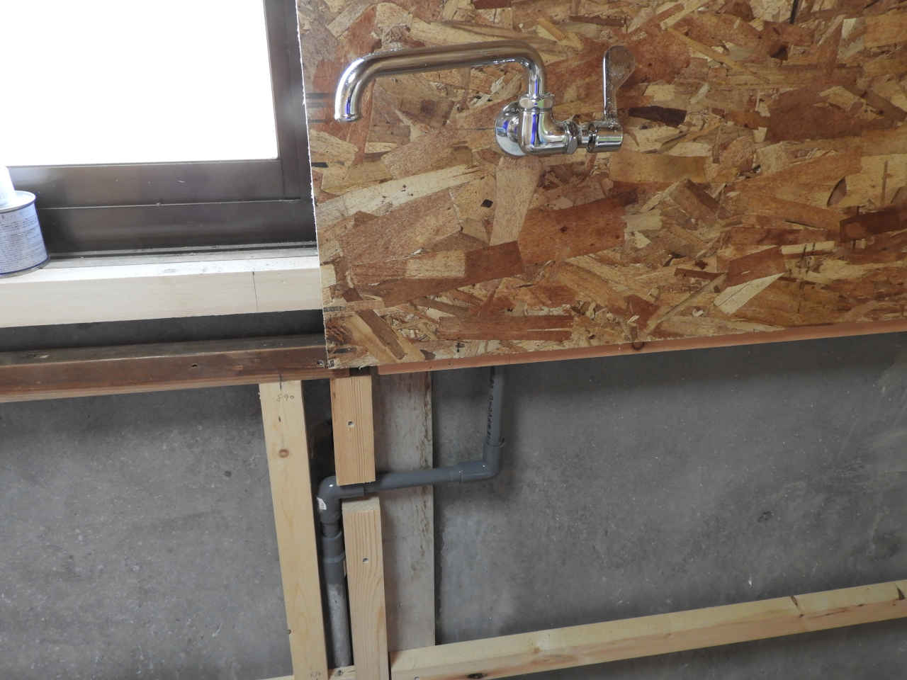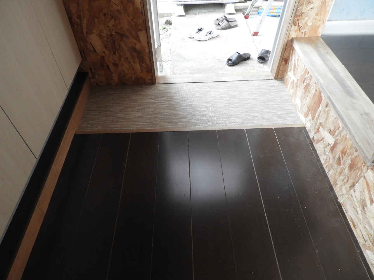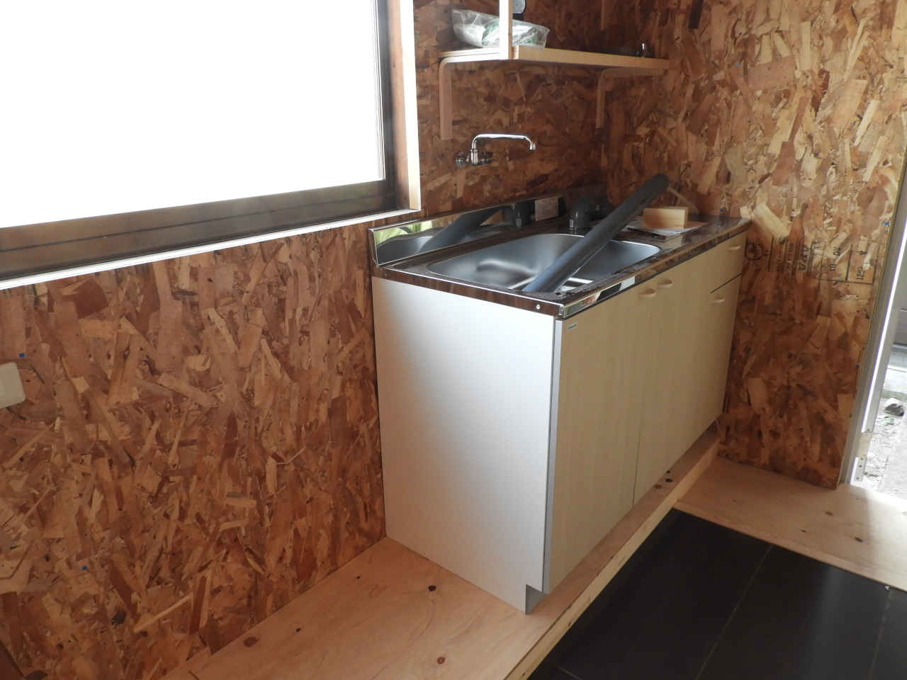 - 排水管の施工のため流し台の下の床を挙げることにする。残り部分はフローリングを貼る。