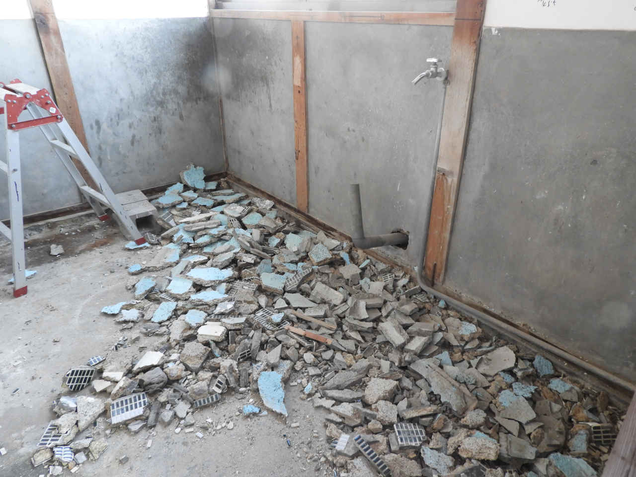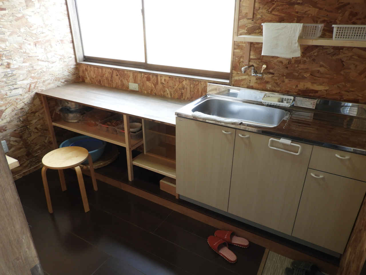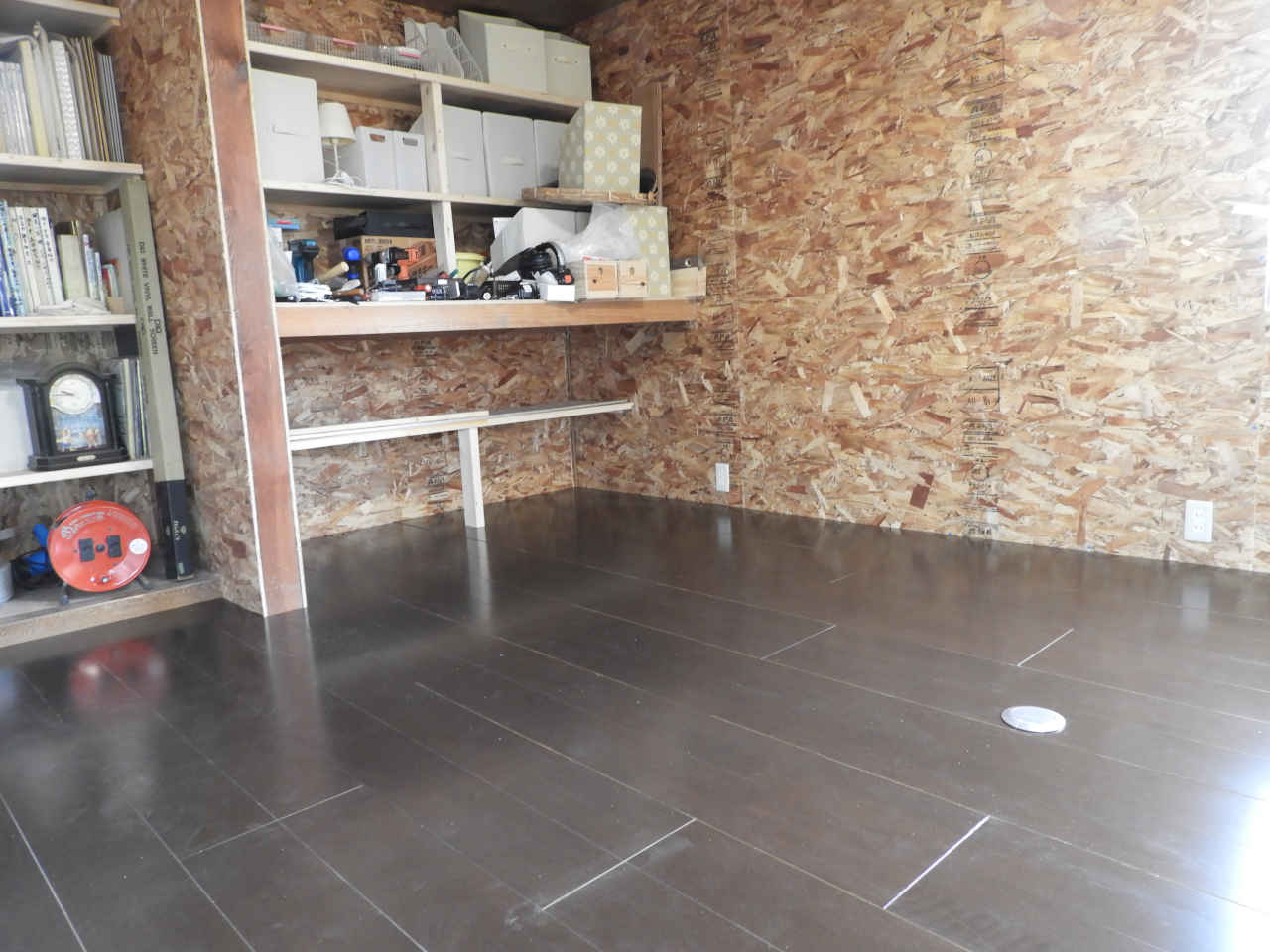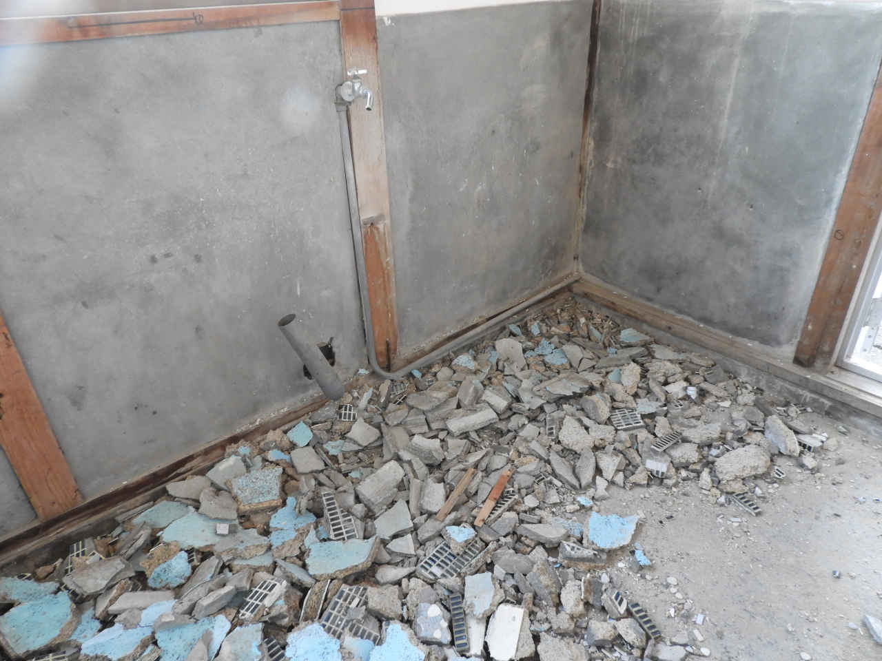 - 排水管の施工のため流し台の下の床を挙げることにする。残り部分はフローリングを貼る。