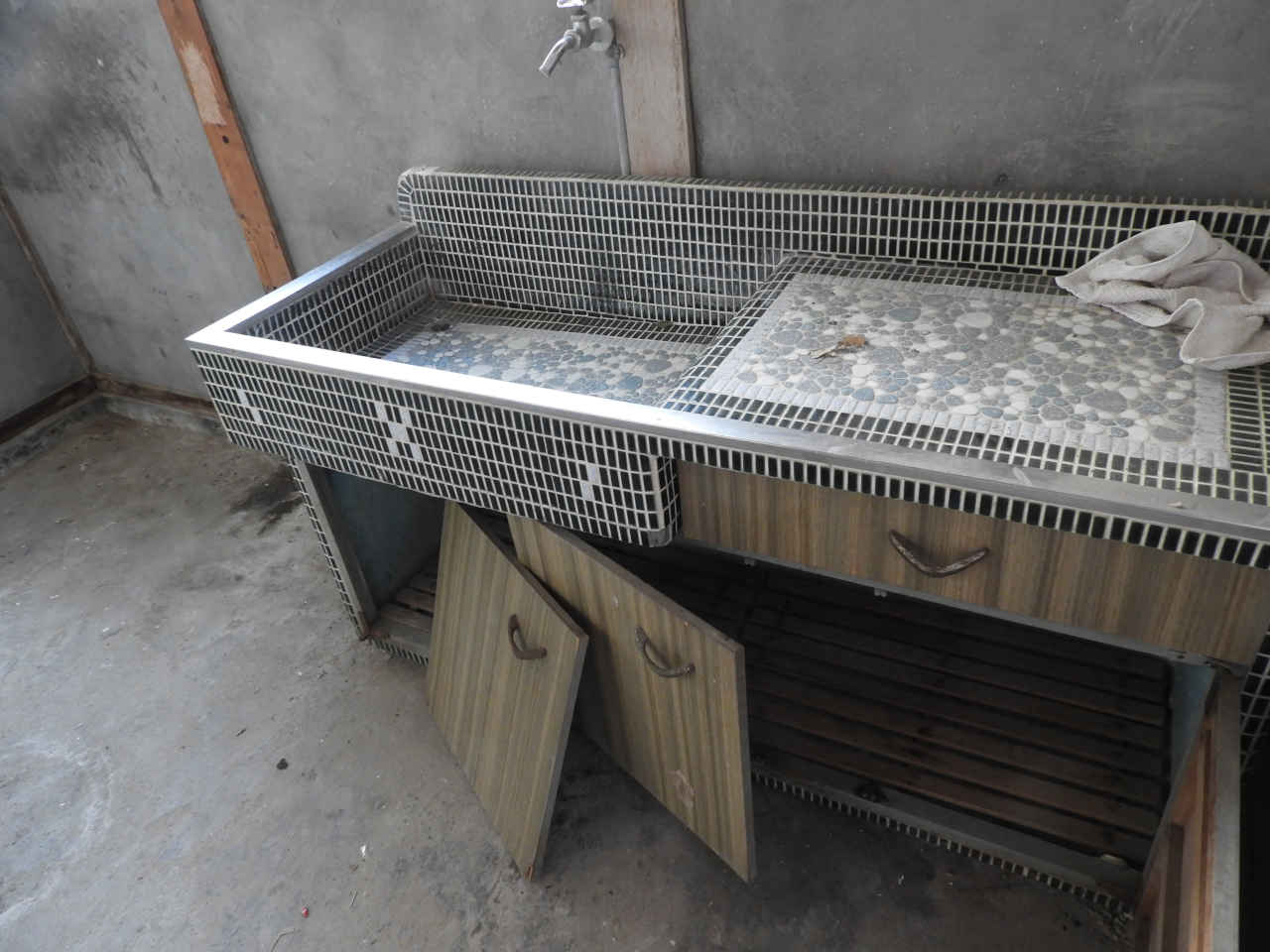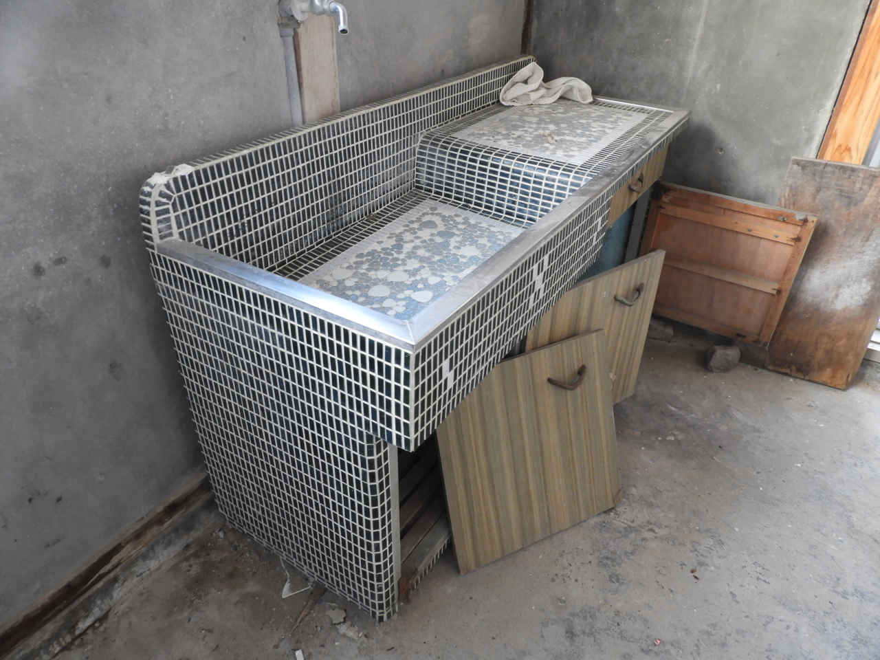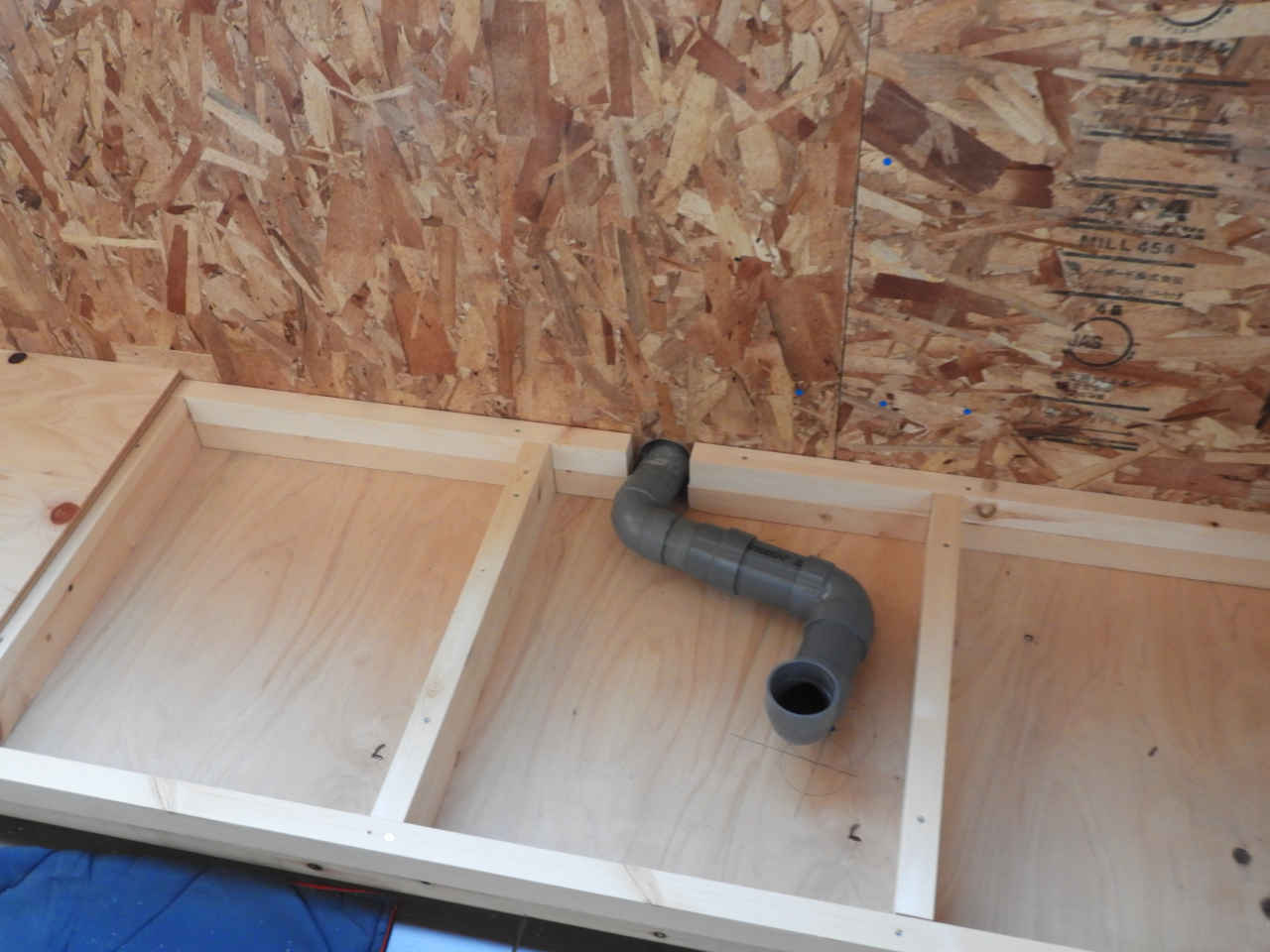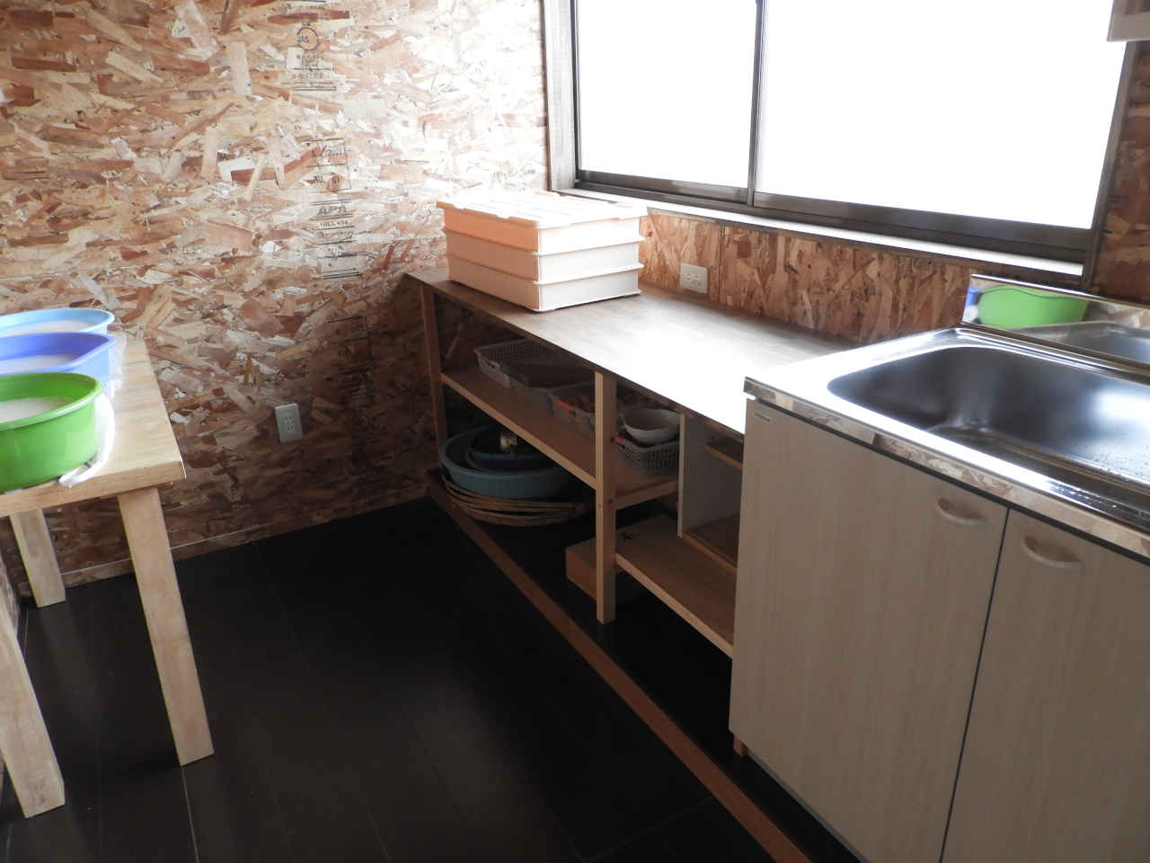- 排水管の施工のため流し台の下の床を挙げることにする。残り部分はフローリングを貼る。