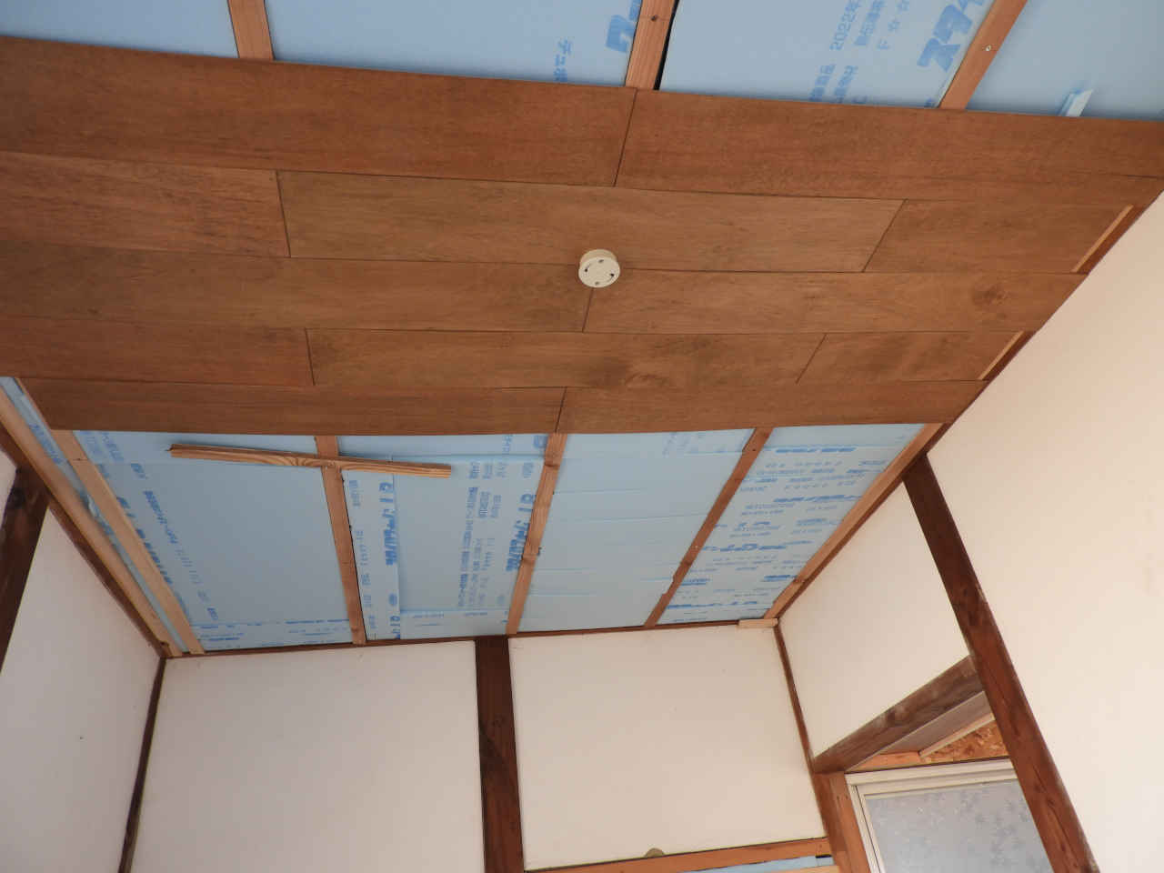 天井板は 8畳間と同じく2.5mmラワンベニヤ板を900x150mmにカットしビンテージワックスを塗布してフィニッシュネイラーで打ち付ける。